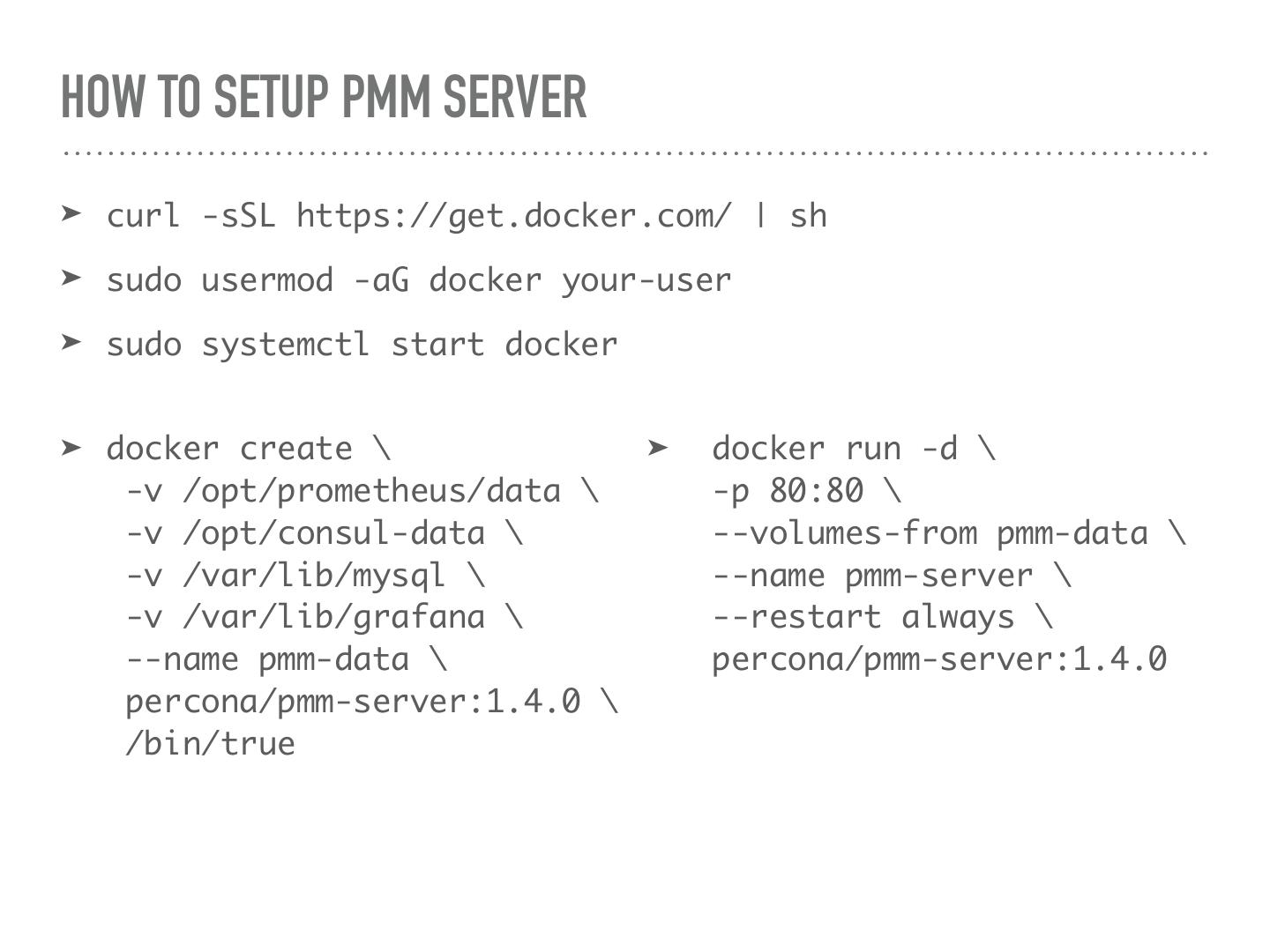 7 .HOW TO SETUP PMM SERVER ➤ curl -sSL https://get.docker.com/ | sh ➤ sudo usermod -aG docker your-user ➤ sudo systemctl start docker ➤ docker create \ ➤ docker run -d \ -v /opt/prometheus/data \ -p 80:80 \ -v /opt/consul-data \ --volumes-from pmm-data \ -v /var/lib/mysql \ --name pmm-server \ -v /var/lib/grafana \ --restart always \ --name pmm-data \ percona/pmm-server:1.4.0 percona/pmm-server:1.4.0 \ /bin/true