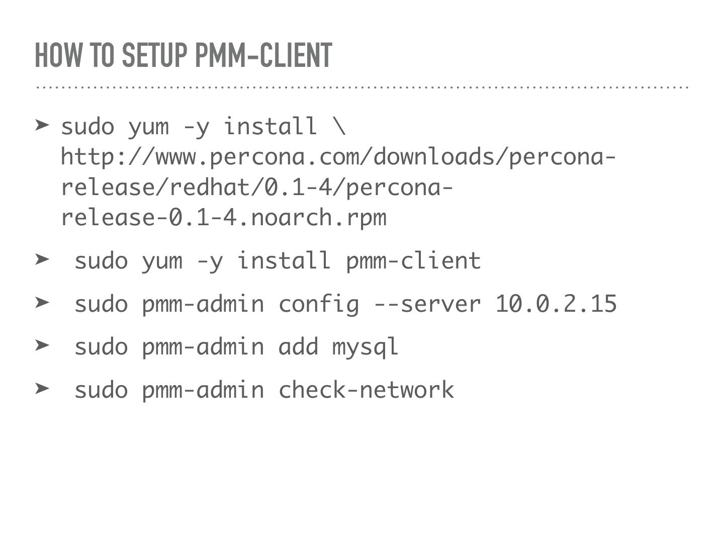 9 .HOW TO SETUP PMM-CLIENT ➤ sudo yum -y install \ http://www.percona.com/downloads/percona- release/redhat/0.1-4/percona- release-0.1-4.noarch.rpm ➤ sudo yum -y install pmm-client ➤ sudo pmm-admin config --server 10.0.2.15 ➤ sudo pmm-admin add mysql ➤ sudo pmm-admin check-network