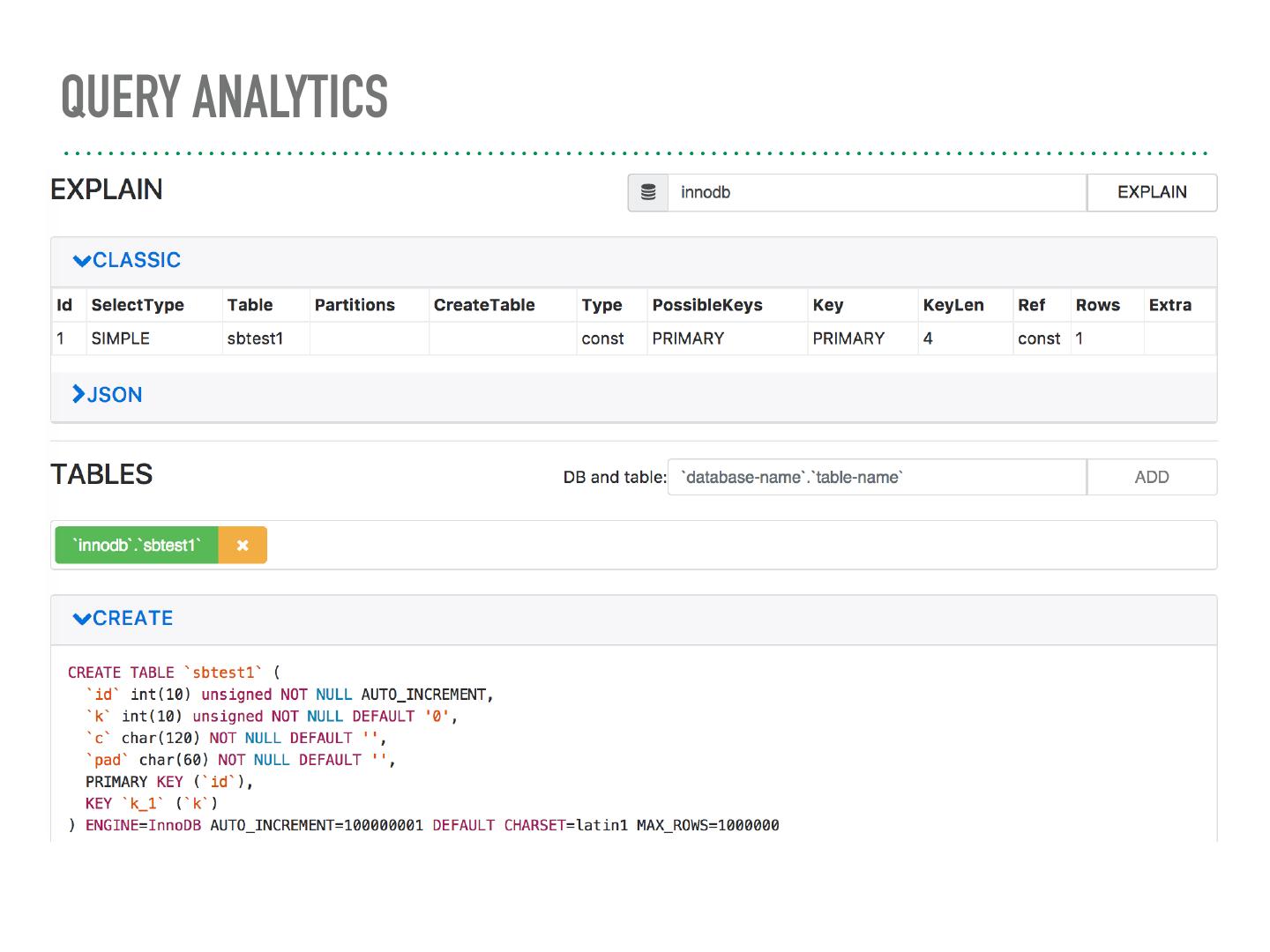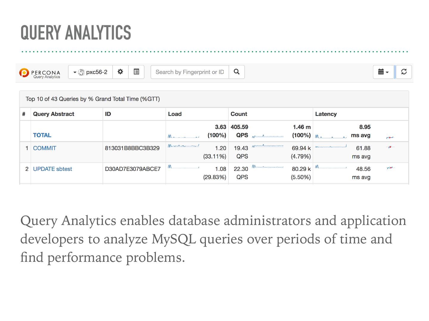 11 .QUERY ANALYTICS Query Analytics enables database administrators and application developers to analyze MySQL queries over periods of time and find performance problems.