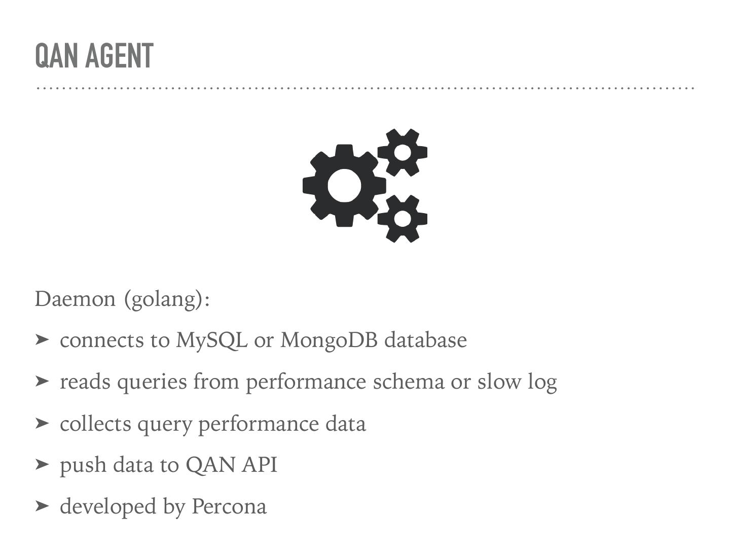 17 .QAN AGENT Daemon (golang): ➤ connects to MySQL or MongoDB database ➤ reads queries from performance schema or slow log ➤ collects query performance data ➤ push data to QAN API ➤ developed by Percona