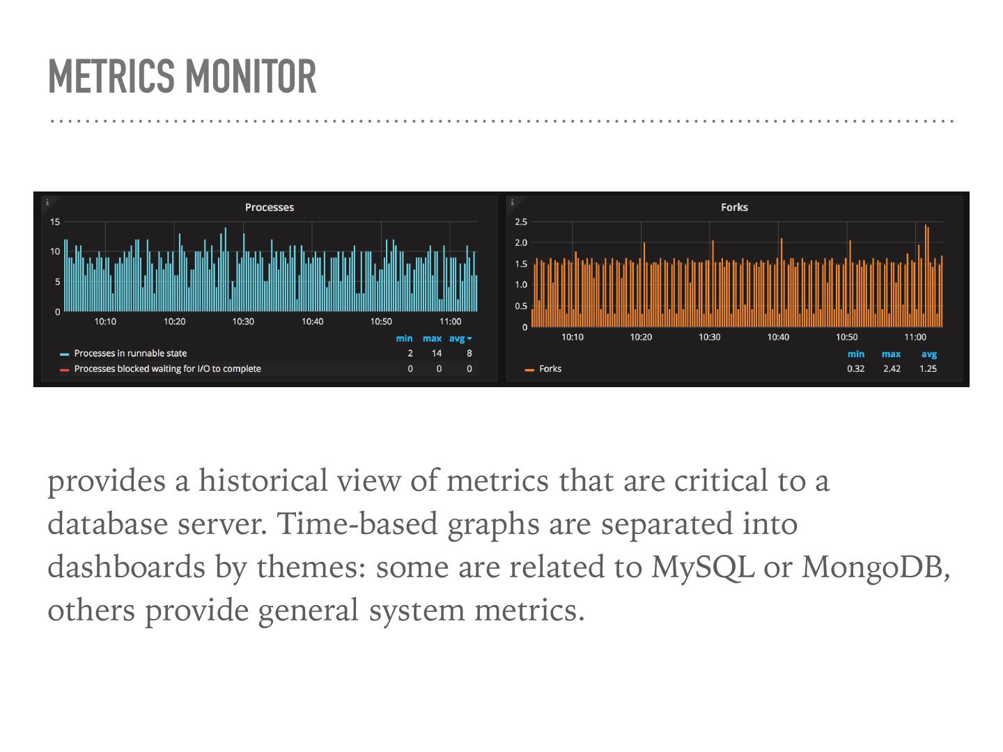 20 .METRICS MONITOR provides a historical view of metrics that are critical to a database server. Time-based graphs are separated into dashboards by themes: some are related to MySQL or MongoDB, others provide general system metrics.