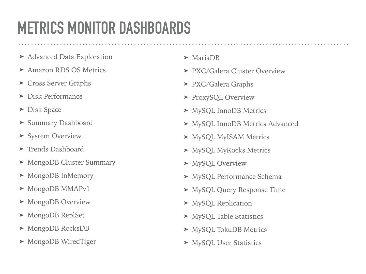 21 .METRICS MONITOR DASHBOARDS ➤ Advanced Data Exploration ➤ MariaDB ➤ Amazon RDS OS Metrics ➤ PXC/Galera Cluster Overview ➤ Cross Server Graphs ➤ PXC/Galera Graphs ➤ Disk Performance ➤ ProxySQL Overview ➤ Disk Space ➤ MySQL InnoDB Metrics ➤ Summary Dashboard ➤ MySQL InnoDB Metrics Advanced ➤ System Overview ➤ MySQL MyISAM Metrics ➤ Trends Dashboard ➤ MySQL MyRocks Metrics ➤ MongoDB Cluster Summary ➤ MySQL Overview ➤ MongoDB InMemory ➤ MySQL Performance Schema ➤ MongoDB MMAPv1 ➤ MySQL Query Response Time ➤ MongoDB Overview ➤ MySQL Replication ➤ MongoDB ReplSet ➤ MySQL Table Statistics ➤ MongoDB RocksDB ➤ MySQL TokuDB Metrics ➤ MongoDB WiredTiger ➤ MySQL User Statistics