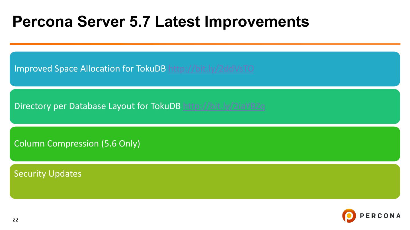 21 .Percona Server for MySQL 5.7 Overview • 100% Compatible with MySQL 5.7 Community Edition • 100% Free and Open Source • Includes Alternatives to Many MySQL Enterprise Features • Includes TokuDB Storage Engine • Focus on Performance and Operational Visibility 21