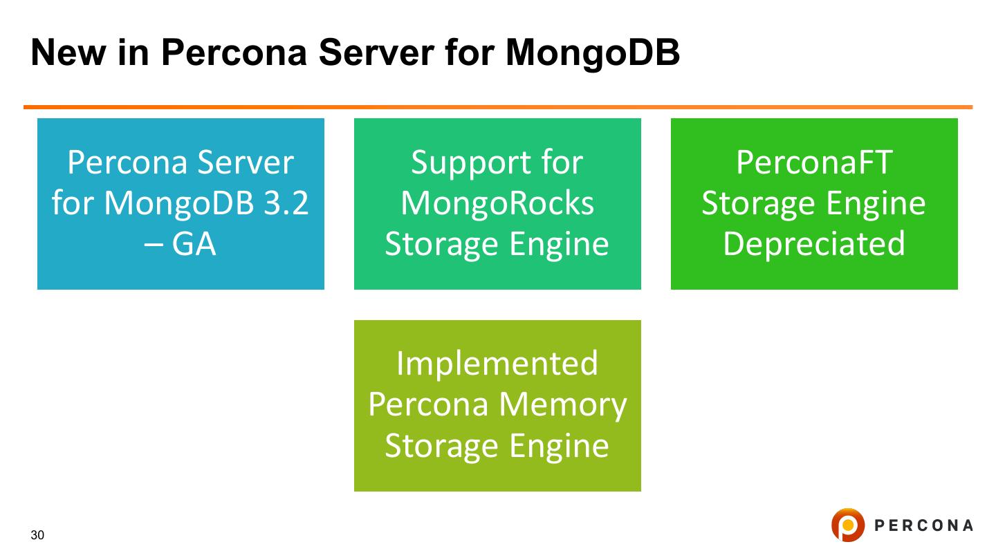 29 .Percona Server for MongoDB 3.2 • 100% Compatible with MongoDB 3.2 Community Edition • 100% Open Source • Alternatives for many MongoDB Enterprise Features • MongoRocks (RocksDB) Storage Engine • Percona Memory Engine 29