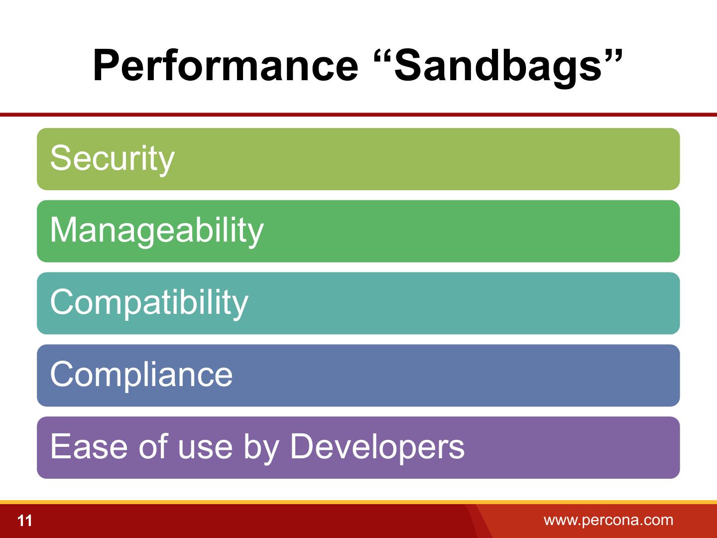 11 . Performance “Sandbags” Security Manageability Compatibility Compliance Ease of use by Developers 11 www.percona.com