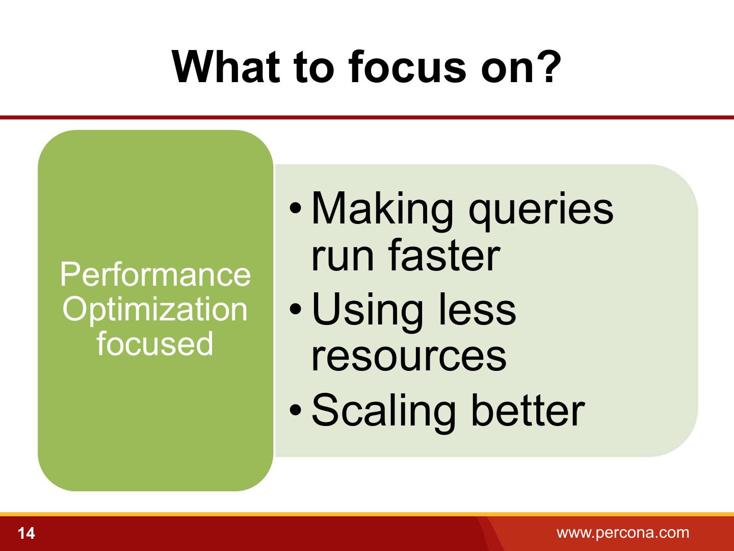 14 . What to focus on? • Making queries Performance run faster Optimization • Using less focused resources • Scaling better 14 www.percona.com