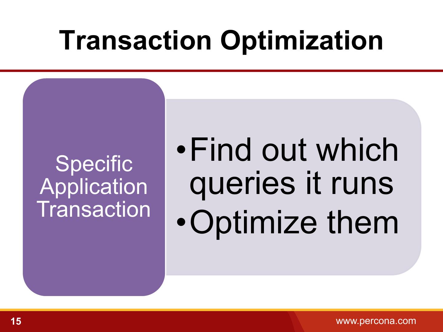 15 . Transaction Optimization Specific •Find out which Application queries it runs Transaction •Optimize them 15 www.percona.com