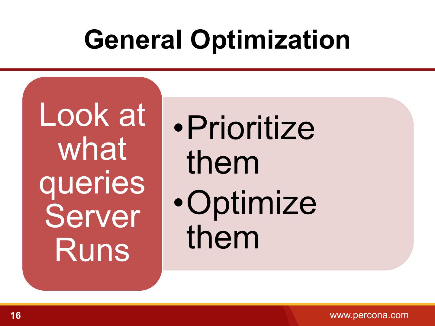 16 . General Optimization Look at •Prioritize what them queries Server •Optimize Runs them 16 www.percona.com