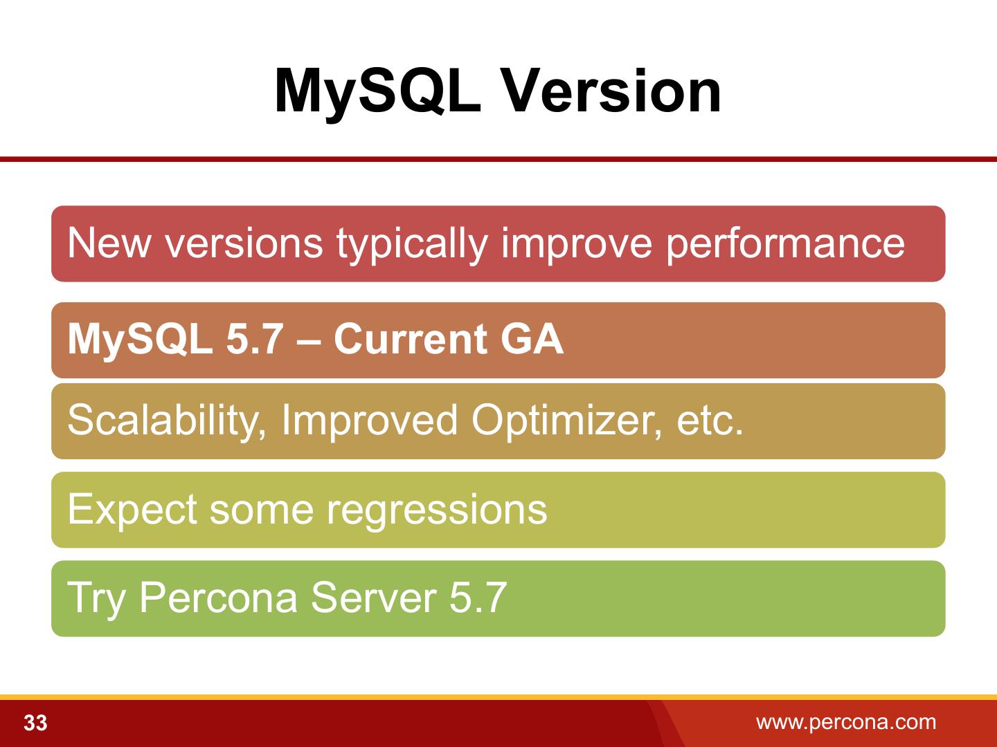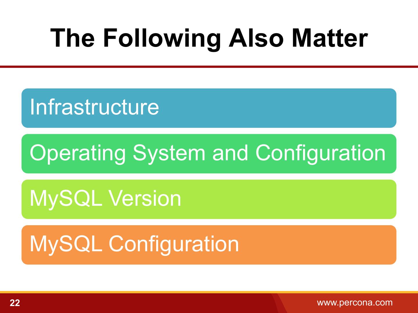22 . The Following Also Matter Infrastructure Operating System and Configuration MySQL Version MySQL Configuration 22 www.percona.com