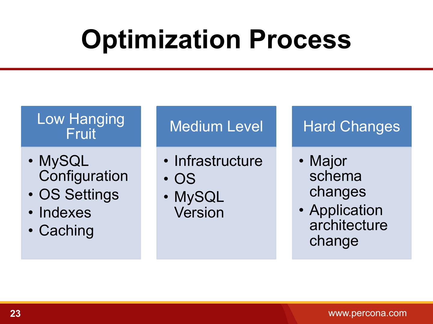 23 . Optimization Process Low Hanging Fruit Medium Level Hard Changes • MySQL • Infrastructure • Major Configuration • OS schema • OS Settings • MySQL changes • Indexes Version • Application • Caching architecture change 23 www.percona.com