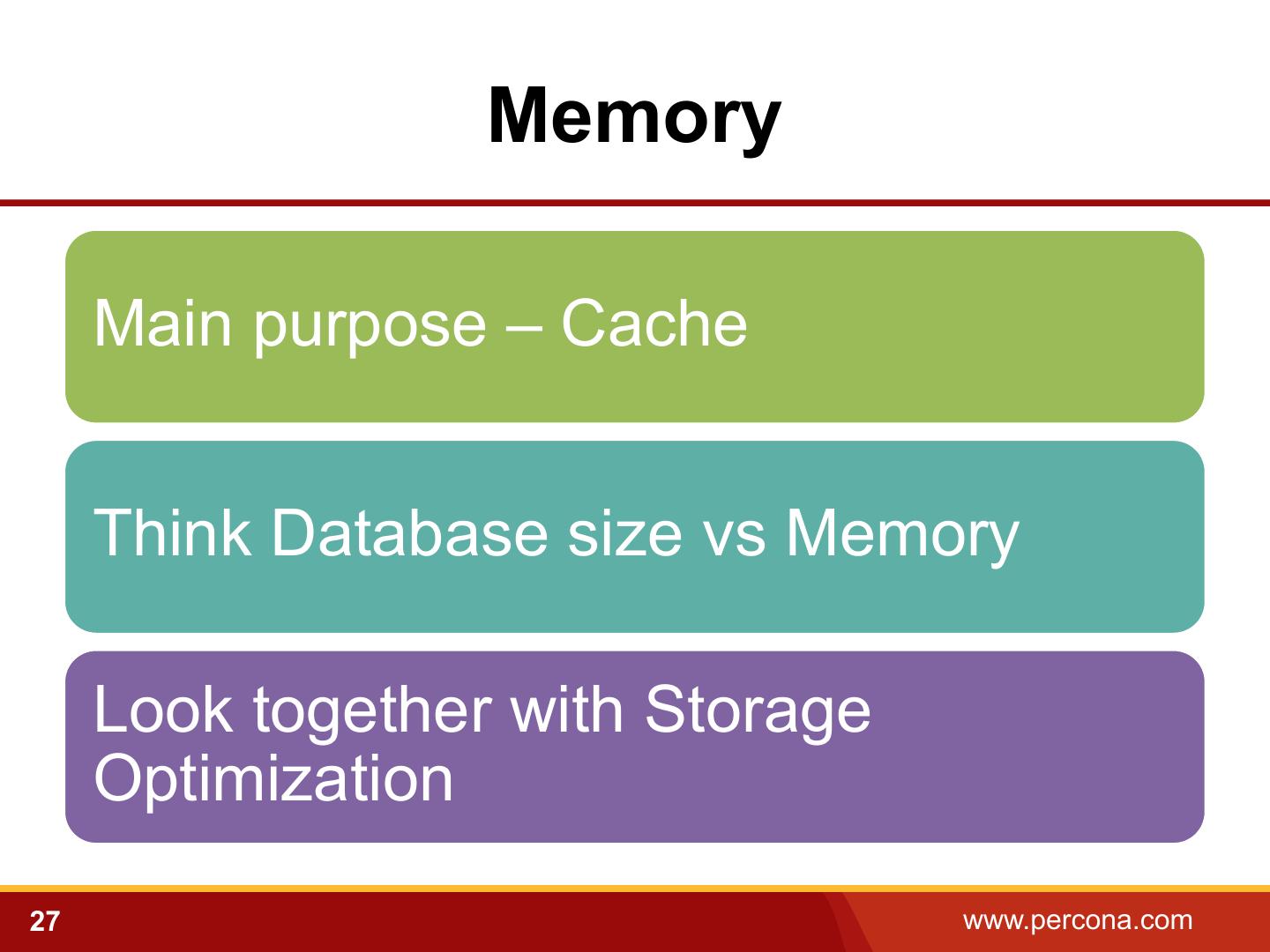 27 . Memory Main purpose – Cache Think Database size vs Memory Look together with Storage Optimization 27 www.percona.com