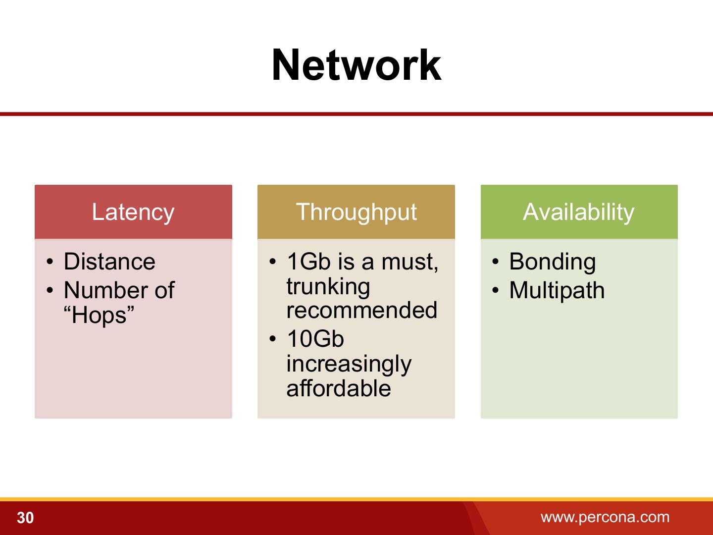 29 . Storage Types Flash RAID • Directly • PCI-E • Hardware Attached • SATA • Software • SAN “Disks” • Filesystem • NAS • TLC, MLC, • Virtualized eMLC, • Cloud SLC 29 www.percona.com