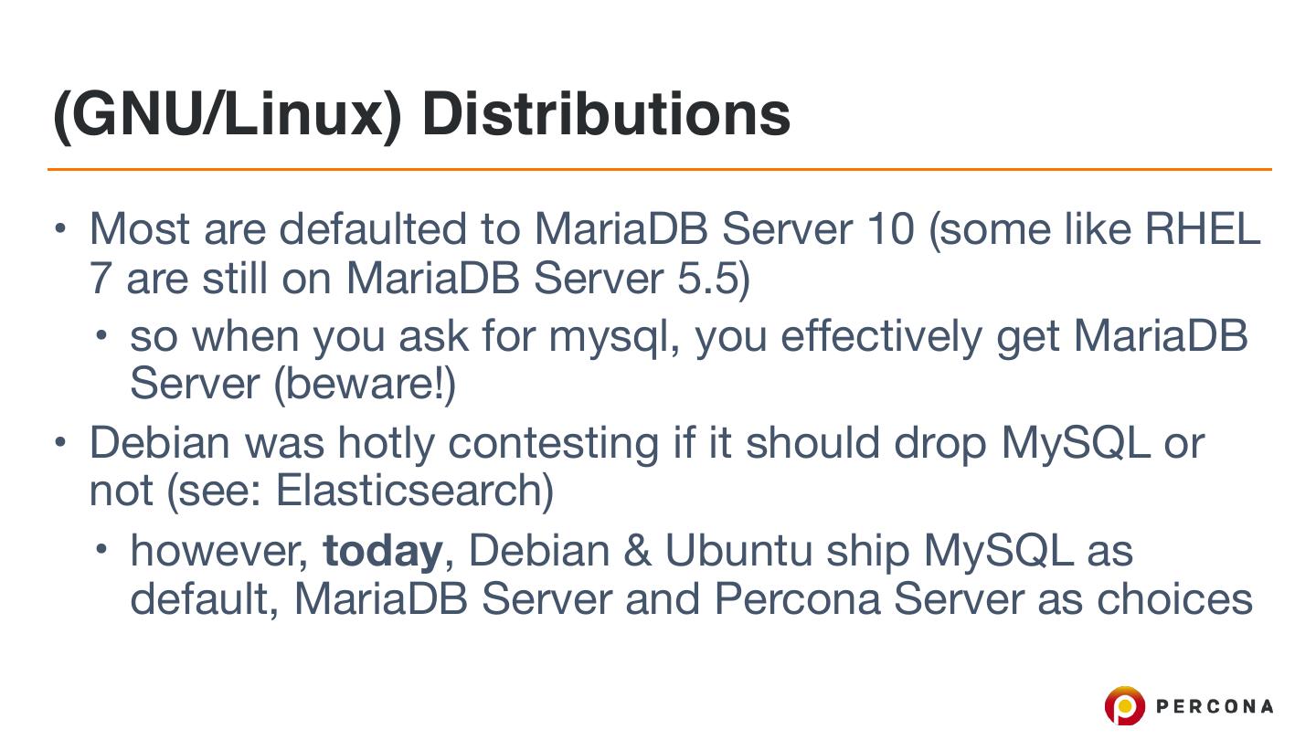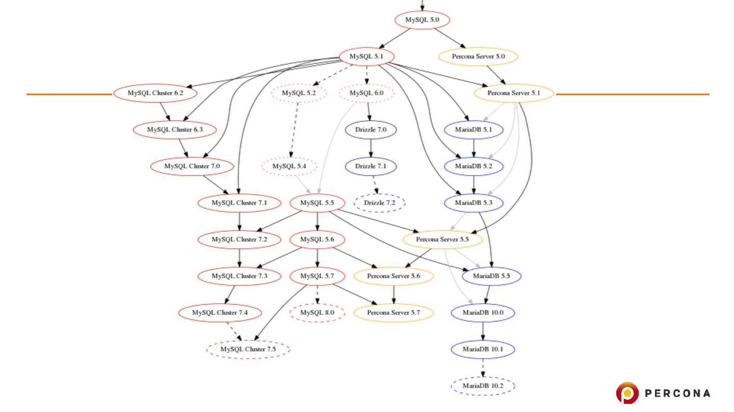 MySQL是一个独特的成人(现在21岁)在很多方面。它支持插件。它支持存储引擎。它也属于Oracle,因此产生了流行的OpenSource数据库的两个分支:Percona服务器和Mariadb服务器。它也曾经生下一个叉子:毛毛雨。最近,一个由网络规模用户组成的联盟(想想十大网站中的一大块)产生了WebscaleSQL。