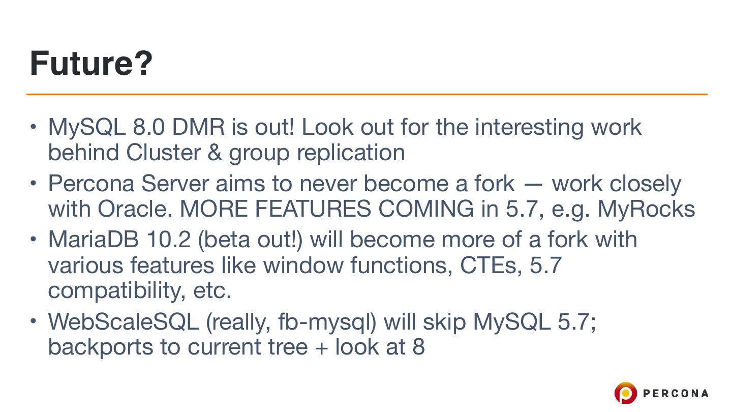 16 .Open source community • MariaDB: takes external contributors/committers • MySQL: 5.7 takes Generated Columns (virtual columns in MariaDB 5.2) from Andrey Zhakov • contributions welcome, commits not • see: MySQL Community Contributor Award Program • WebScaleSQL: Alibaba, Facebook, Google, LinkedIn, and Twitter (w/ Percona + MariaDB also agreeing to work on it) • Percona: bug reports/feature requests welcome, commits not (yet)