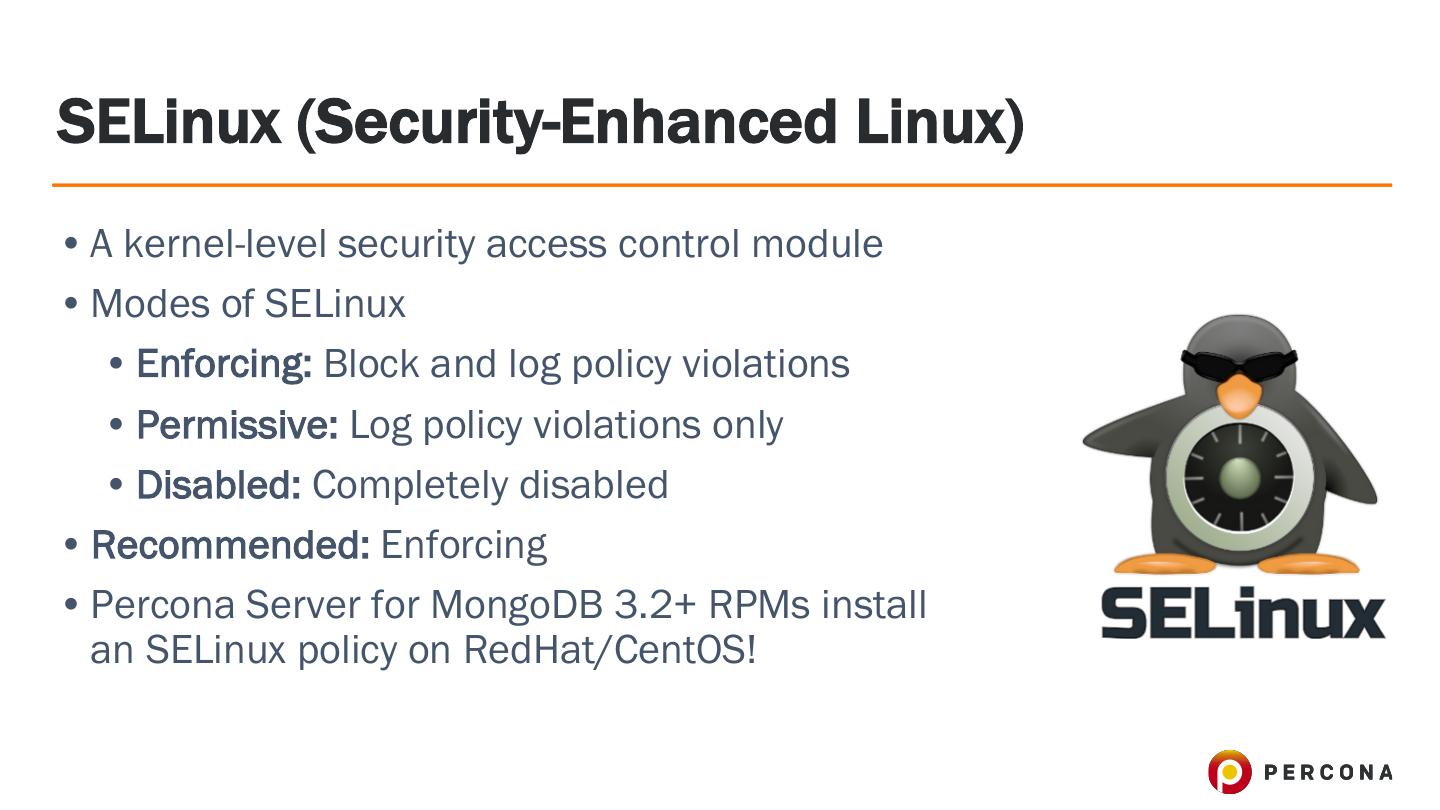 19 .SELinux (Security-Enhanced Linux) • A kernel-level security access control module • Modes of SELinux • Enforcing: Block and log policy violations • Permissive: Log policy violations only • Disabled: Completely disabled • Recommended: Enforcing • Percona Server for MongoDB 3.2+ RPMs install an SELinux policy on RedHat/CentOS!