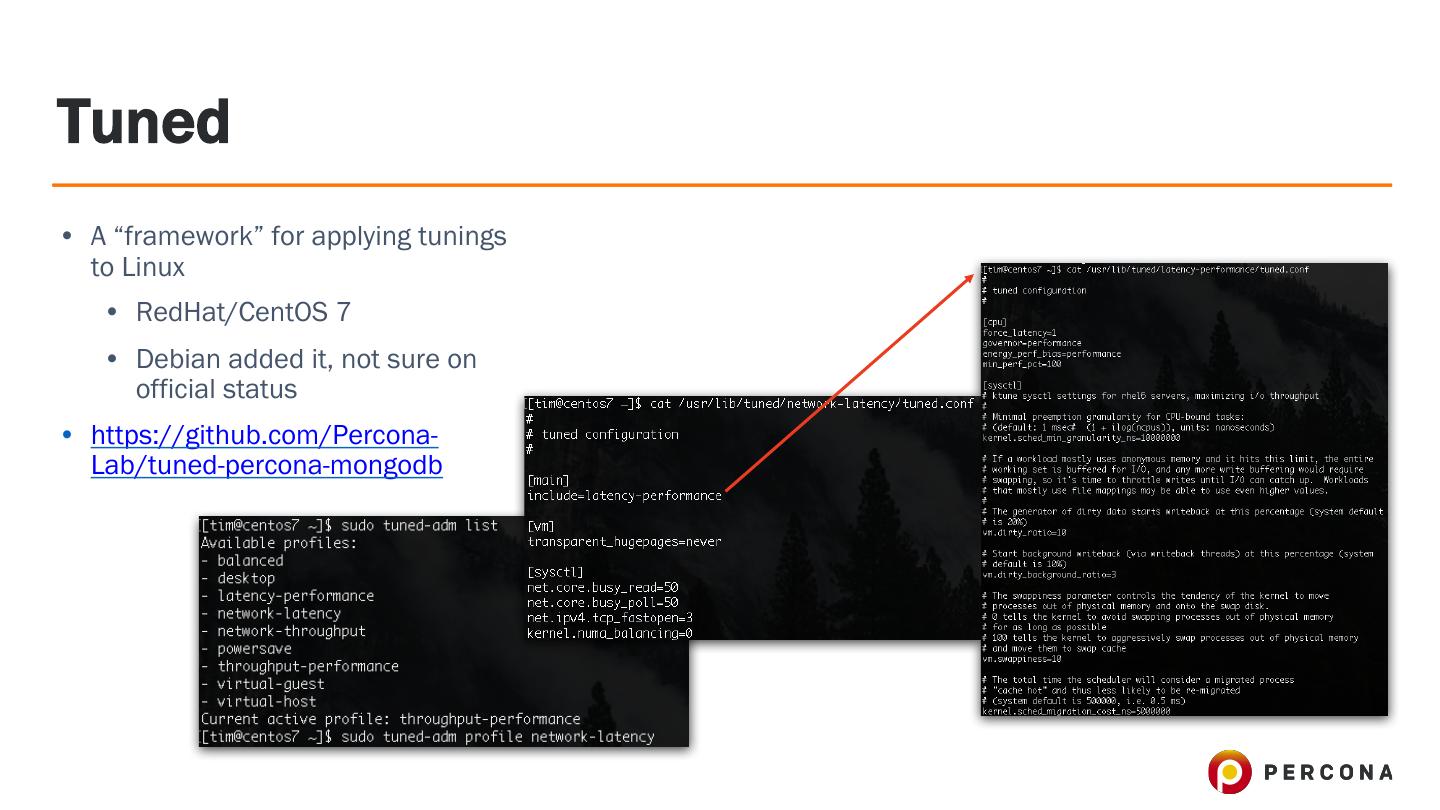 20 .Tuned • A “framework” for applying tunings to Linux • RedHat/CentOS 7 • Debian added it, not sure on official status • https://github.com/Percona- Lab/tuned-percona-mongodb