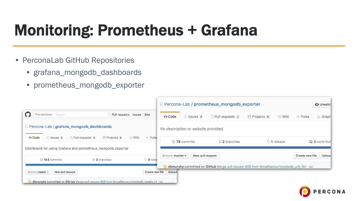 23 .Monitoring: Prometheus + Grafana • PerconaLab GitHub Repositories • grafana_mongodb_dashboards • prometheus_mongodb_exporter