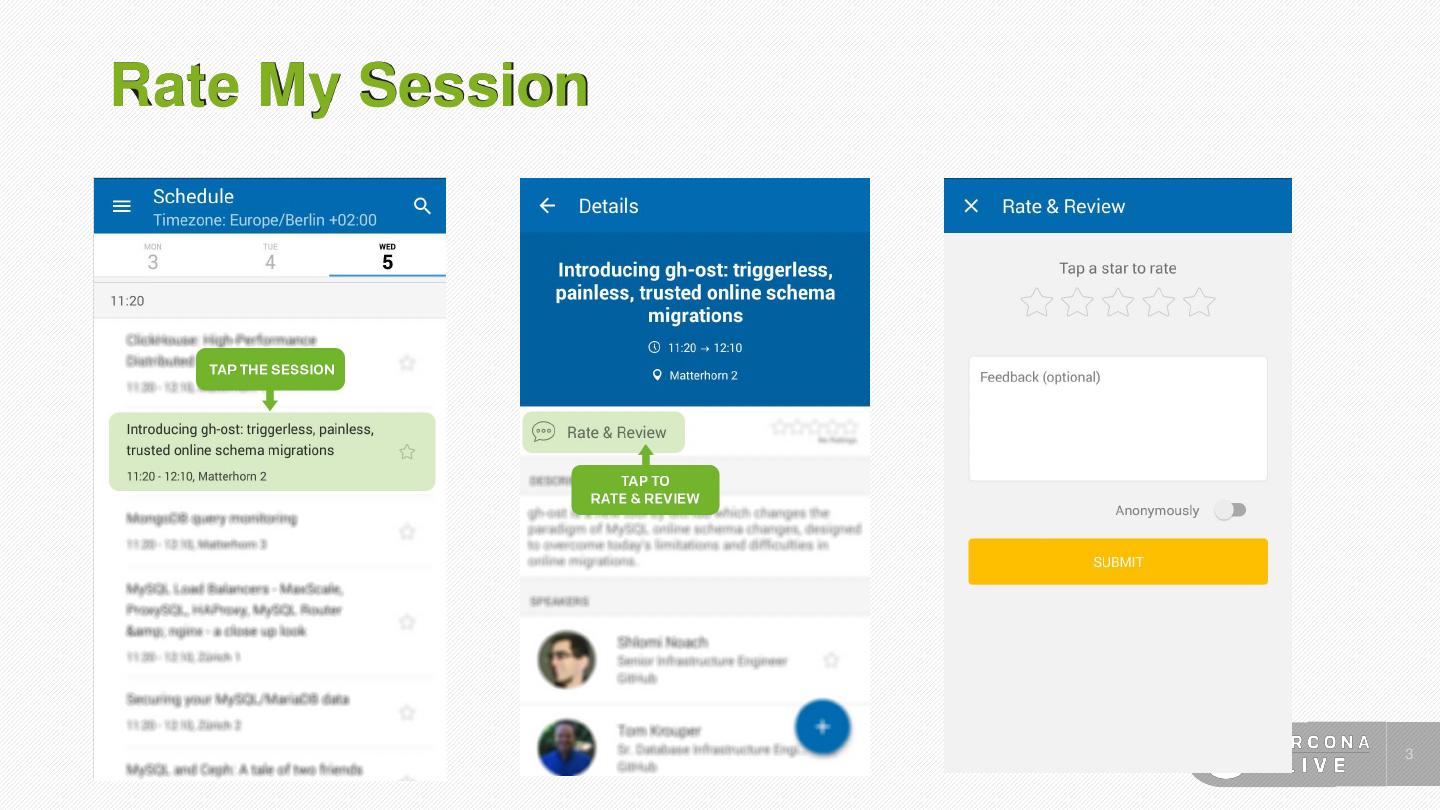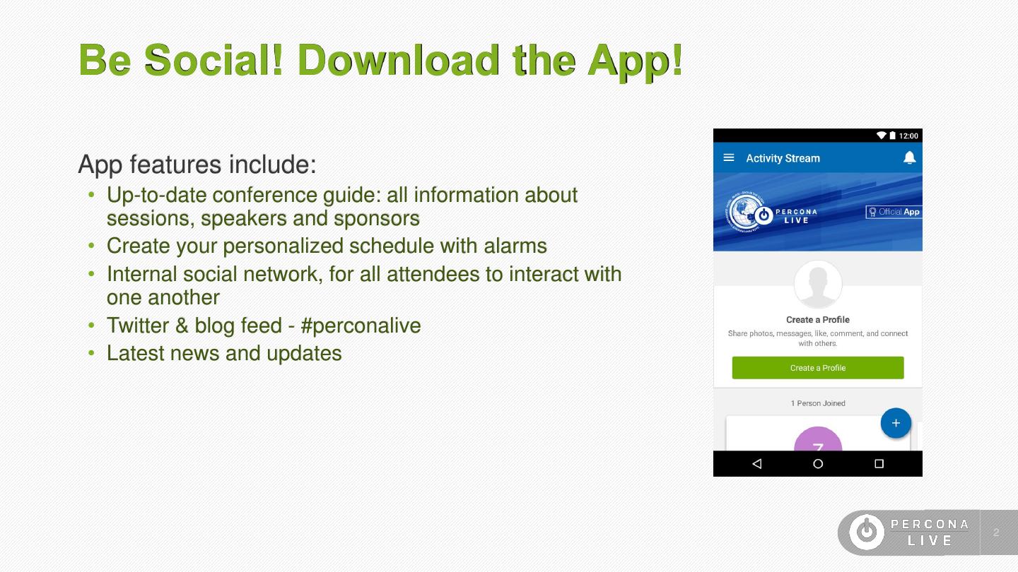 2 .Be Social! Download the App! App features include: • Up-to-date conference guide: all information about sessions, speakers and sponsors • Create your personalized schedule with alarms • Internal social network, for all attendees to interact with one another • Twitter & blog feed - #perconalive • Latest news and updates 2