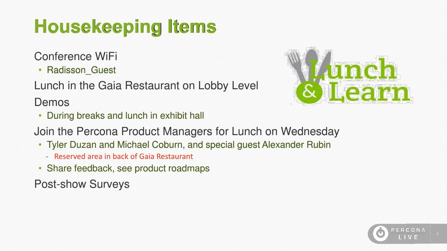 4 .Housekeeping Items Conference WiFi • Radisson_Guest Lunch in the Gaia Restaurant on Lobby Level Demos • During breaks and lunch in exhibit hall Join the Percona Product Managers for Lunch on Wednesday • Tyler Duzan and Michael Coburn, and special guest Alexander Rubin - Reserved area in back of Gaia Restaurant • Share feedback, see product roadmaps Post-show Surveys 4