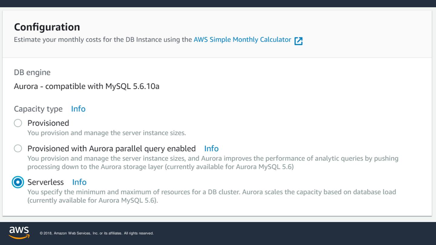 1 .AWS Aurora Serverless Zero to Serverless in 60 seconds © 2018, Amazon Web Services, Inc. or its affiliates. All rights reserved. 1