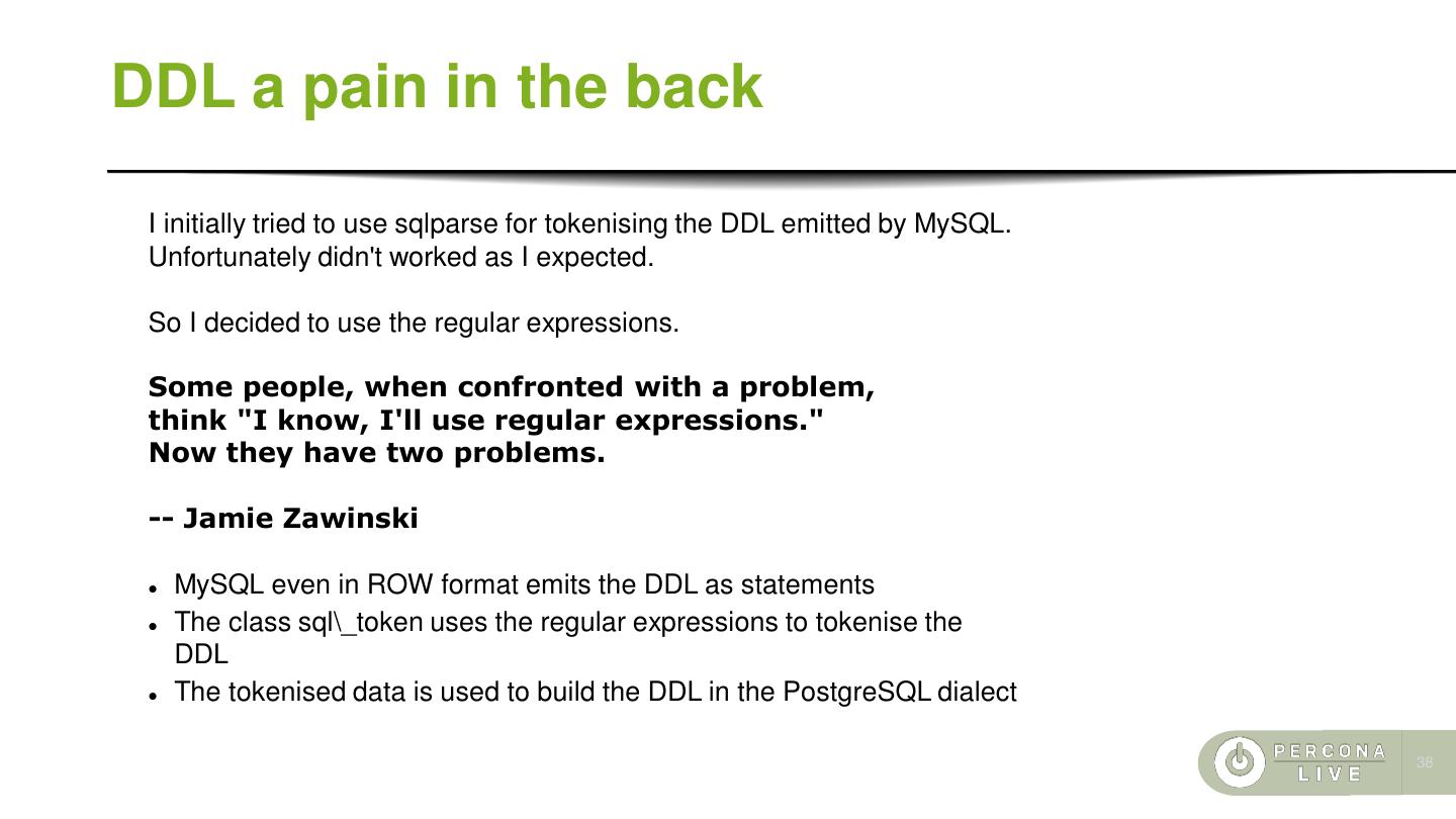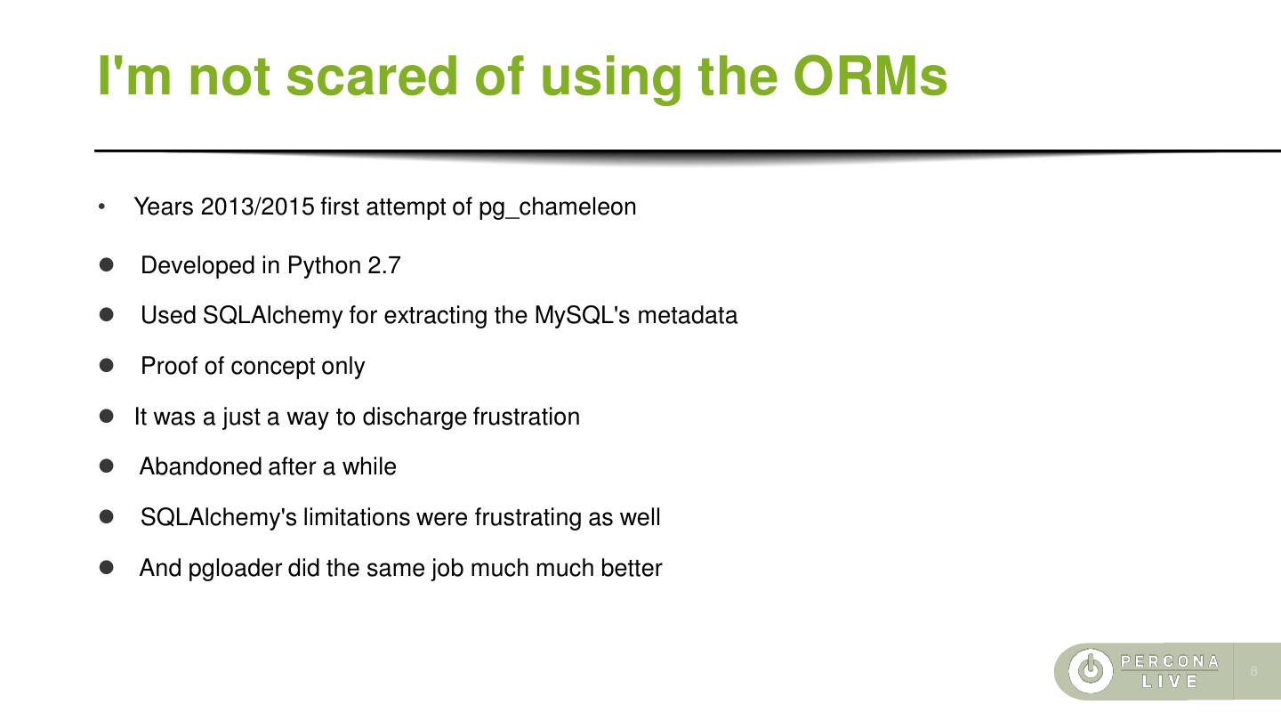 8 .I'm not scared of using the ORMs • Years 2013/2015 first attempt of pg_chameleon ⚫ Developed in Python 2.7 ⚫ Used SQLAlchemy for extracting the MySQL's metadata ⚫ Proof of concept only ⚫ It was a just a way to discharge frustration ⚫ Abandoned after a while ⚫ SQLAlchemy's limitations were frustrating as well ⚫ And pgloader did the same job much much better 8