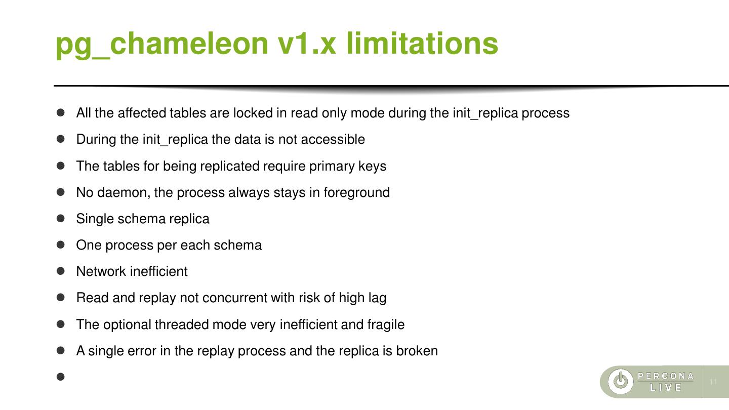 10 .pg_chameleon v1.x ⚫ Developed on the London to Brighton commute ⚫ Released as stable the 7th May 2017 ⚫ Followed by 8 bugfix releases\pause ⚫ Compatible with CPython 2.7/3.3+ ⚫ No more SQLAlchemy ⚫ The MySQL driver changed from MySQLdb to PyMySQL ⚫ Command line helper ⚫ Supports type override on the fly (Danger!) ⚫ Installs in virtualenv and system wide via pypi ⚫ Can detach the replica for minimal downtime migrations 10