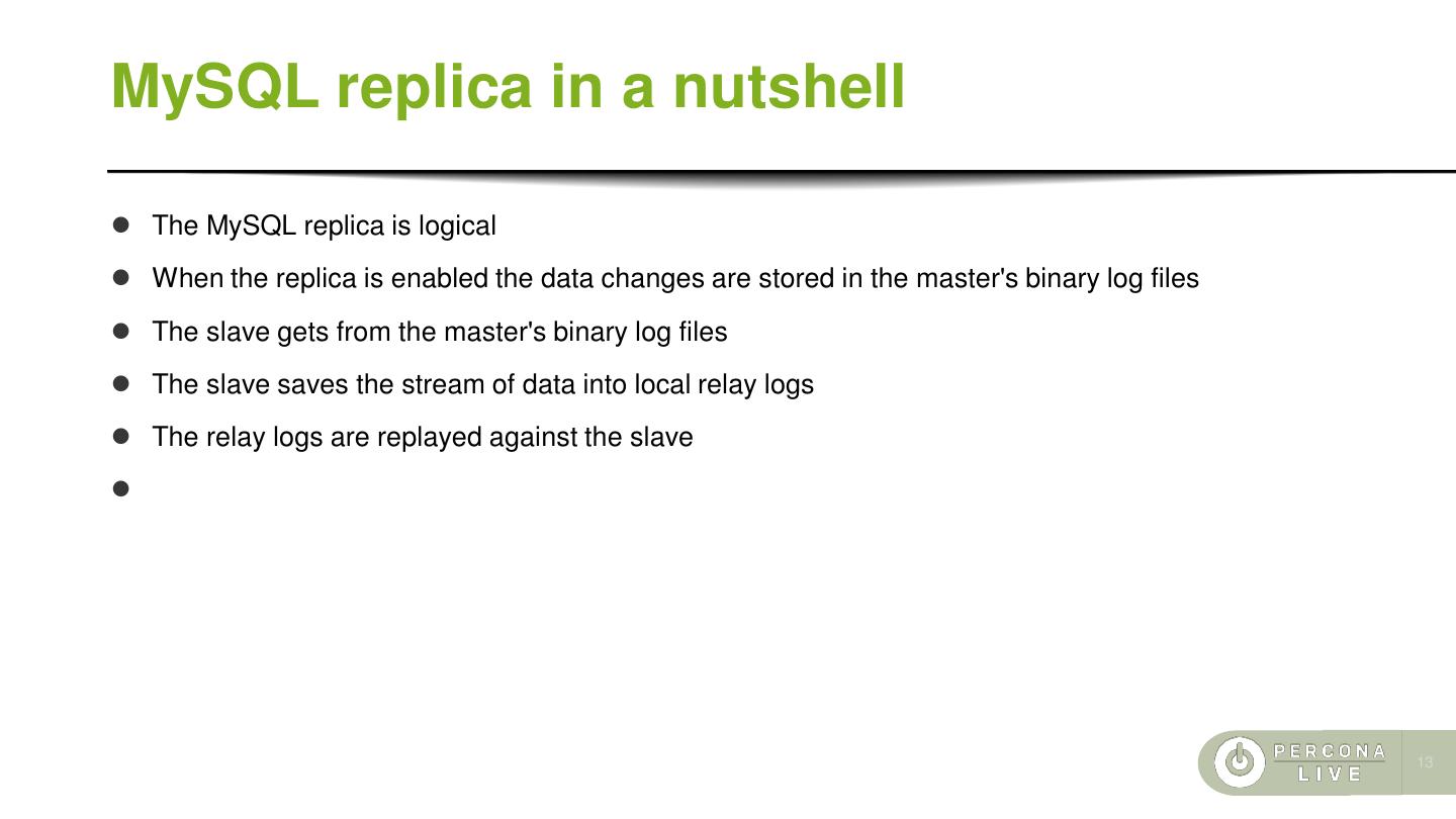 13 .MySQL replica in a nutshell ⚫ The MySQL replica is logical ⚫ When the replica is enabled the data changes are stored in the master's binary log files ⚫ The slave gets from the master's binary log files ⚫ The slave saves the stream of data into local relay logs ⚫ The relay logs are replayed against the slave ⚫ 13