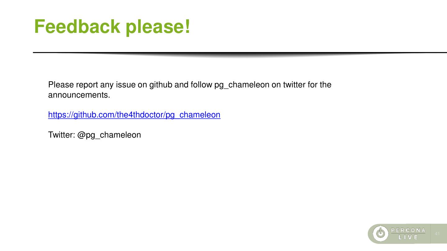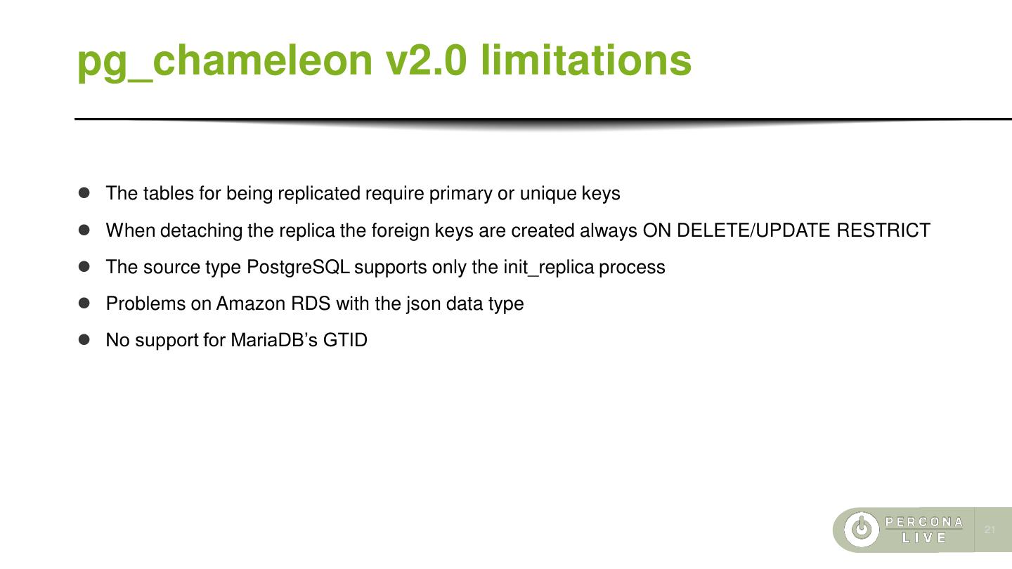 20 .pg_chameleon v2.0 ⚫ Soft locking replica initialisation. The tables are locked only during the copy. ⚫ Rollbar integration for a simpler error detection and messaging ⚫ Experimental support for the PostgreSQL source type ⚫ The tables are loaded in a separate schema which is swapped with the existing. ⚫ This approach requires more space but it makes the init a replica virtually painless, leaving the old data accessible until the init_replica is complete. ⚫ The DDL are translated in the PostgreSQL dialect keeping the schema in sync with MySQL automatically ⚫ MySQL GTID support for switch across the replica cluster without need for init_replica 20