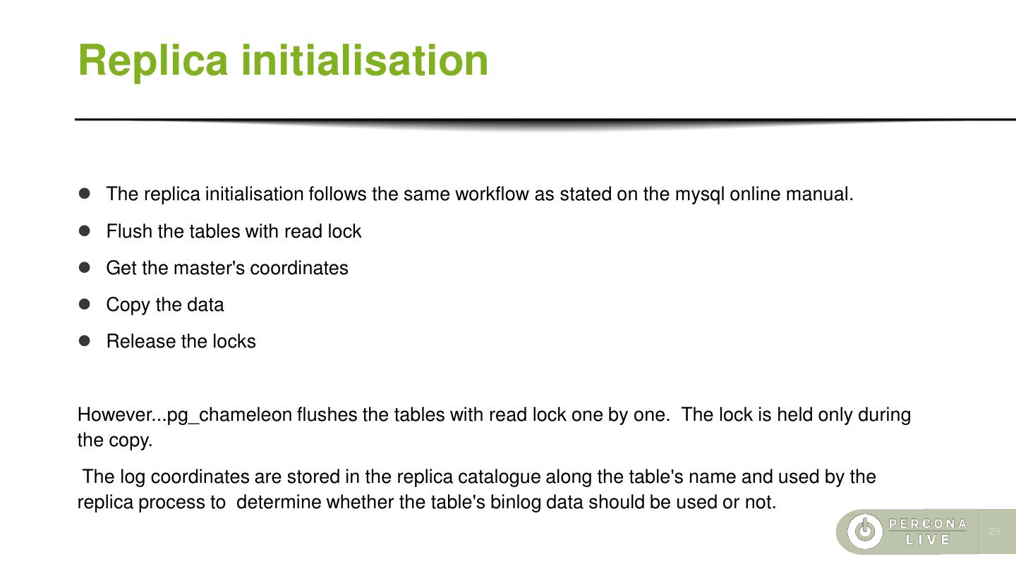 23 .Replica initialisation ⚫ The replica initialisation follows the same workflow as stated on the mysql online manual. ⚫ Flush the tables with read lock ⚫ Get the master's coordinates ⚫ Copy the data ⚫ Release the locks However...pg_chameleon flushes the tables with read lock one by one. The lock is held only during the copy. The log coordinates are stored in the replica catalogue along the table's name and used by the replica process to determine whether the table's binlog data should be used or not. 23