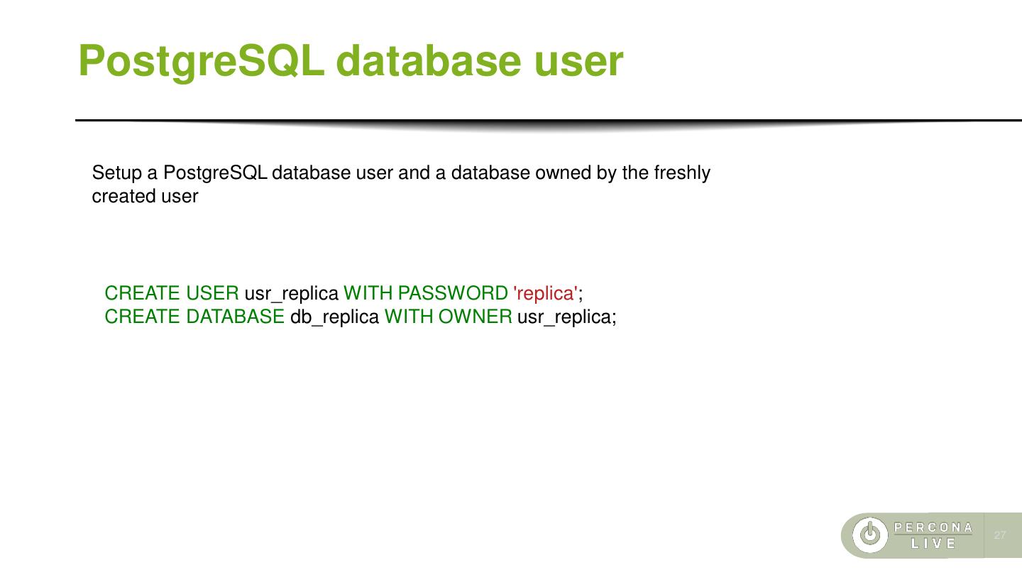27 .PostgreSQL database user Setup a PostgreSQL database user and a database owned by the freshly created user CREATE USER usr_replica WITH PASSWORD 'replica'; CREATE DATABASE db_replica WITH OWNER usr_replica; 27