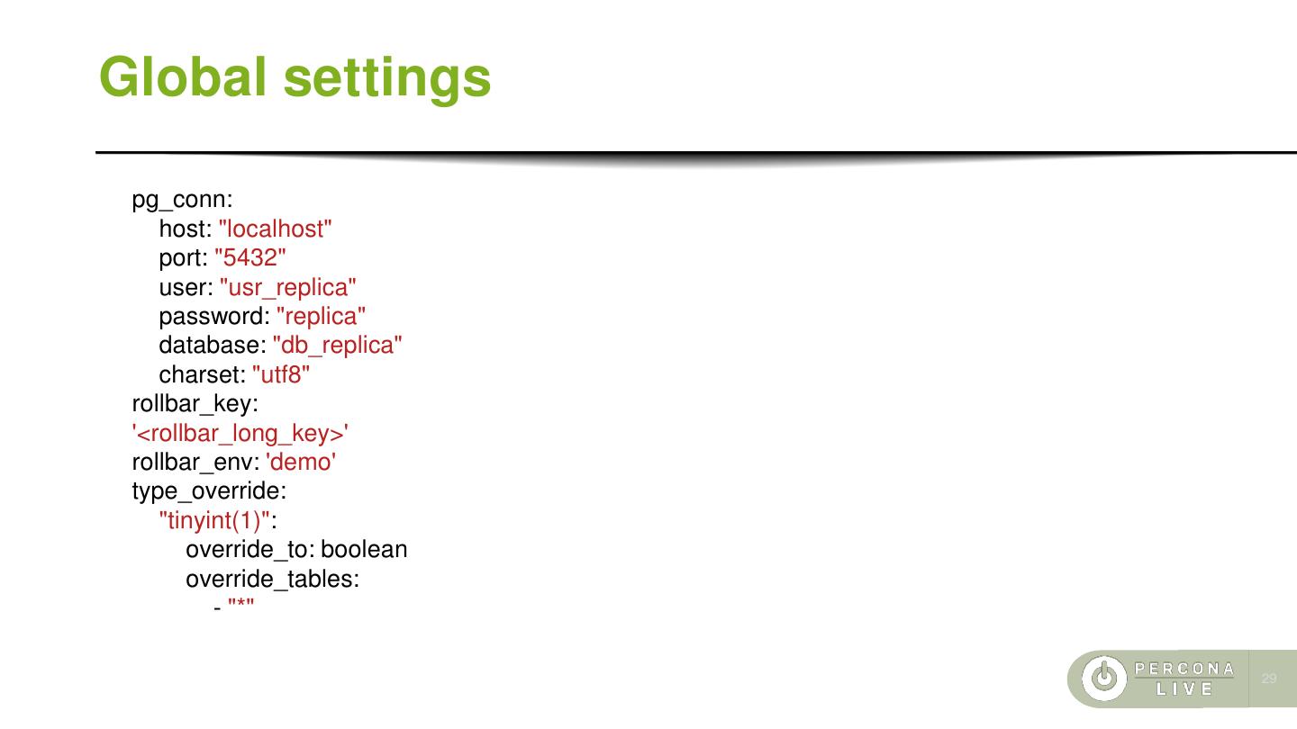 29 .Global settings pg_conn: host: "localhost" port: "5432" user: "usr_replica" password: "replica" database: "db_replica" charset: "utf8" rollbar_key: '<rollbar_long_key>' rollbar_env: 'demo' type_override: "tinyint(1)": override_to: boolean override_tables: - "*" 29
