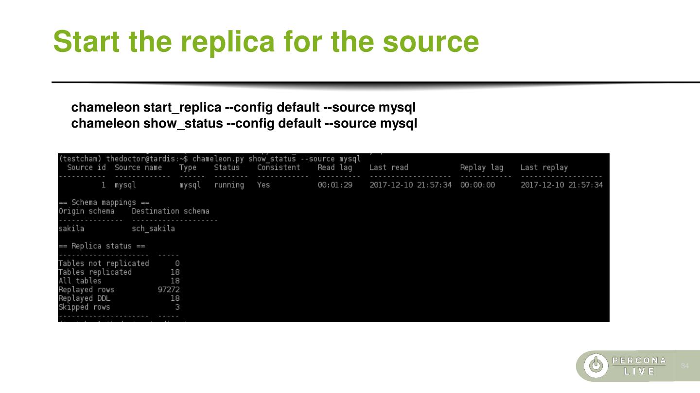 28 .Install pg_chameleon Install pg_chameleon and create the configuration files. Edit the file default.yml and set the correct values for connection and source. pip install pip --upgrade pip install pg_chameleon chameleon set_configuration_files cd ~/.pg_chameleon/configuration cp config-example.yml default.yml 28