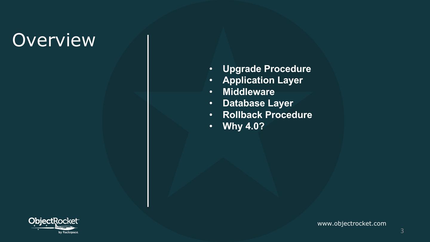 3 .Overview • Upgrade Procedure • Application Layer • Middleware • Database Layer • Rollback Procedure • Why 4.0? www.objectrocket.com 3