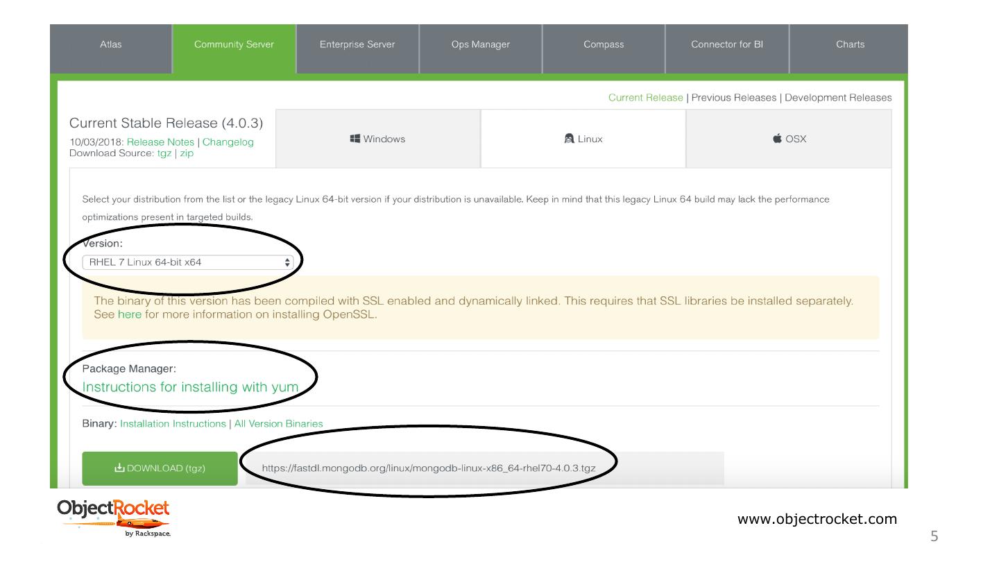 4 .MongoDB 4.0 MongoDB 4.0 released on June 26,2018 Current minor version is 4.0.3 You can obtain it from: - Mongo Inc Download Center - Percona Server Download Center - Repos like yum, apt-get… www.objectrocket.com 4