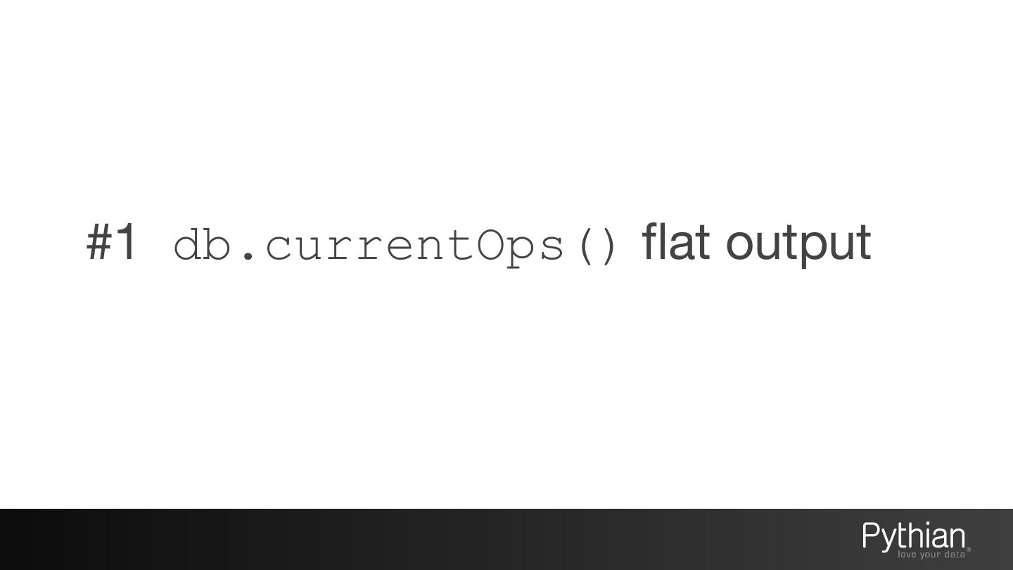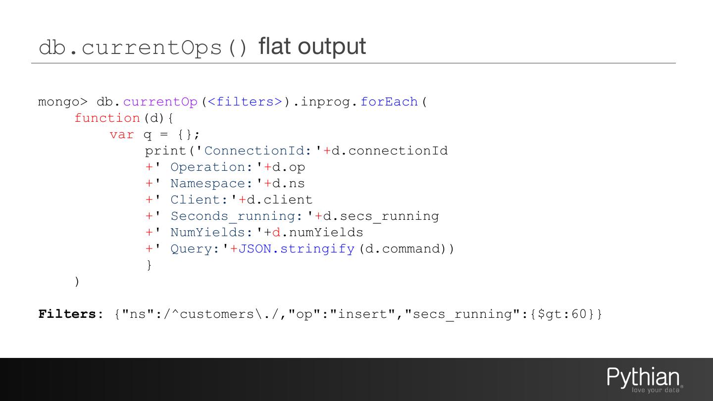 3 .db.currentOps() flat output mongo> db. currentOp(<filters>).inprog.forEach( function(d){ var q = {}; print('ConnectionId: '+d.connectionId +' Operation: '+d.op +' Namespace: '+d.ns +' Client:'+d.client +' Seconds_running: '+d.secs_running +' NumYields: '+d.numYields +' Query:'+JSON.stringify (d.command)) } ) Filters: {"ns":/^customers\./,"op":"insert","secs_running":{$gt:60}}
