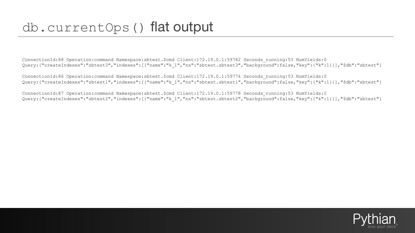 4 .db.currentOps() flat output ConnectionId:88 Operation:command Namespace:sbtest.$cmd Client:172.19.0.1:59782 Seconds_running:53 NumYields:0 Query:{"createIndexes":"sbtest3","indexes":[{"name":"k_1","ns":"sbtest.sbtest3","background":false,"key":{"k":1}}],"$db":"sbtest"} ConnectionId:86 Operation:command Namespace:sbtest.$cmd Client:172.19.0.1:59774 Seconds_running:53 NumYields:0 Query:{"createIndexes":"sbtest1","indexes":[{"name":"k_1","ns":"sbtest.sbtest1","background":false,"key":{"k":1}}],"$db":"sbtest"} ConnectionId:87 Operation:command Namespace:sbtest.$cmd Client:172.19.0.1:59778 Seconds_running:53 NumYields:0 Query:{"createIndexes":"sbtest2","indexes":[{"name":"k_1","ns":"sbtest.sbtest2","background":false,"key":{"k":1}}],"$db":"sbtest"}