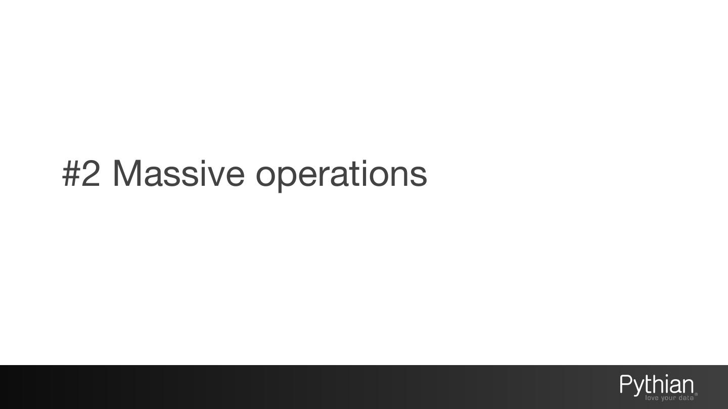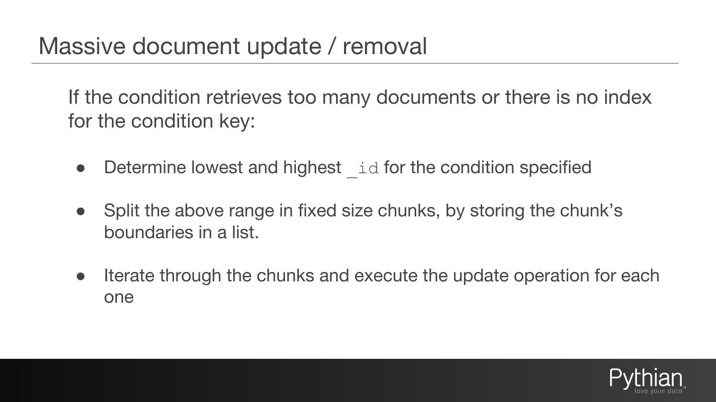 6 .Massive document update / removal If the condition retrieves too many documents or there is no index for the condition key: ● Determine lowest and highest _id for the condition specified ● Split the above range in fixed size chunks, by storing the chunk’s boundaries in a list. ● Iterate through the chunks and execute the update operation for each one