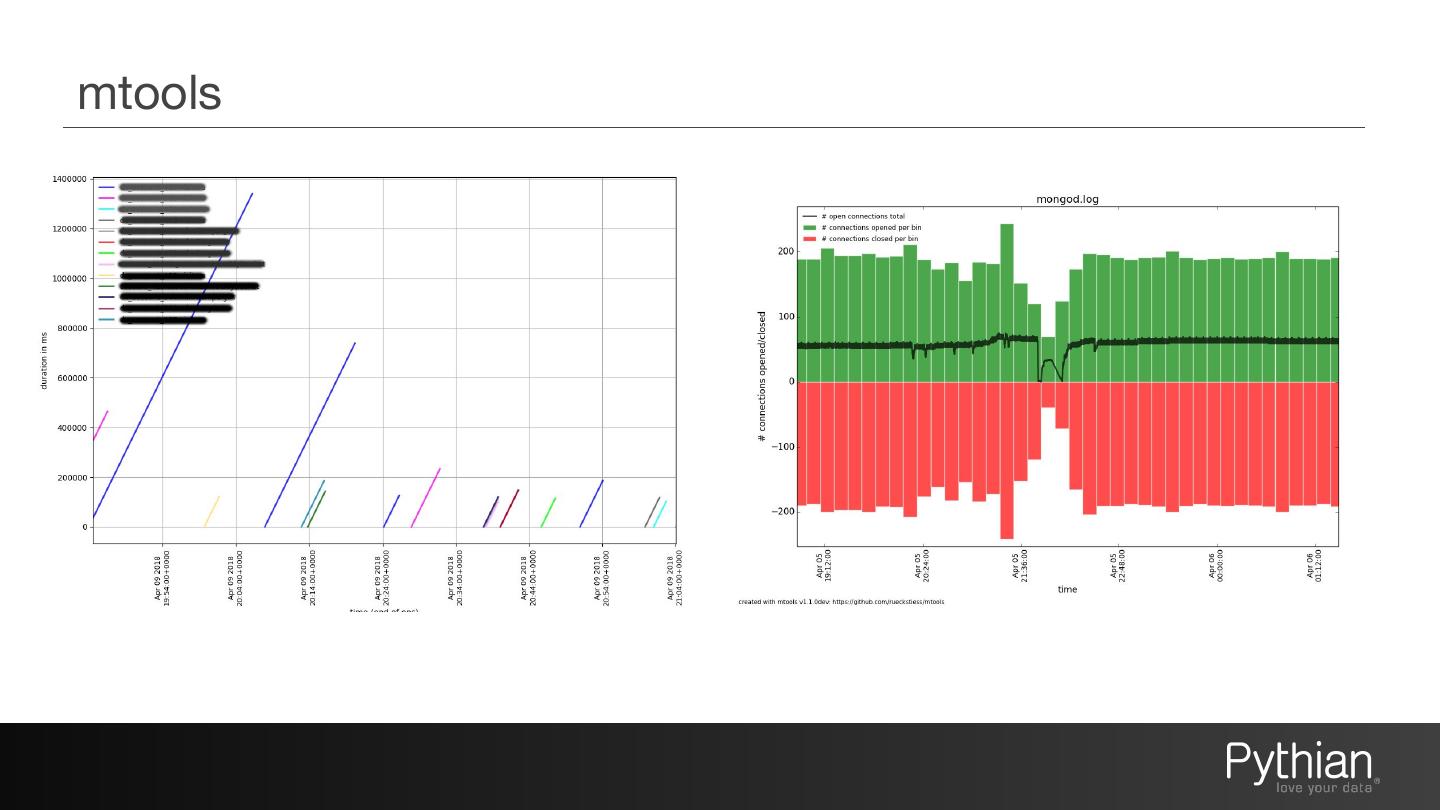 12 .mtools Written in python. For when the profiler is disabled. ● mlogfilter ○ --operation OP ○ --pattern P ○ --slow MS ○ --scan ○ --from FROM --to TO ● mplotqueries
