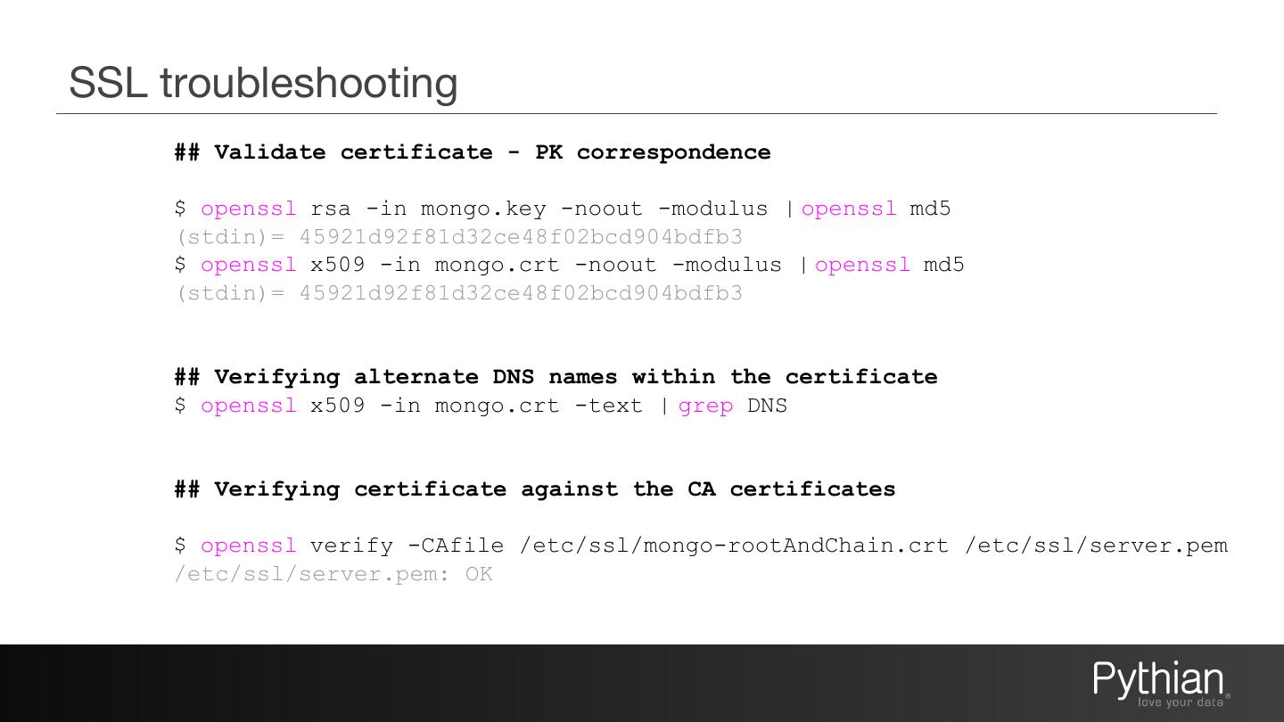 15 .SSL troubleshooting ## Validate certificate - PK correspondence $ openssl rsa -in mongo.key -noout -modulus | openssl md5 (stdin)= 45921d92f81d32ce48f02bcd904bdfb3 $ openssl x509 -in mongo.crt -noout -modulus | openssl md5 (stdin)= 45921d92f81d32ce48f02bcd904bdfb3 ## Verifying alternate DNS names within the certificate $ openssl x509 -in mongo.crt -text | grep DNS ## Verifying certificate against the CA certificates $ openssl verify -CAfile /etc/ssl/mongo-rootAndChain.crt /etc/ssl/server.pem /etc/ssl/server.pem: OK