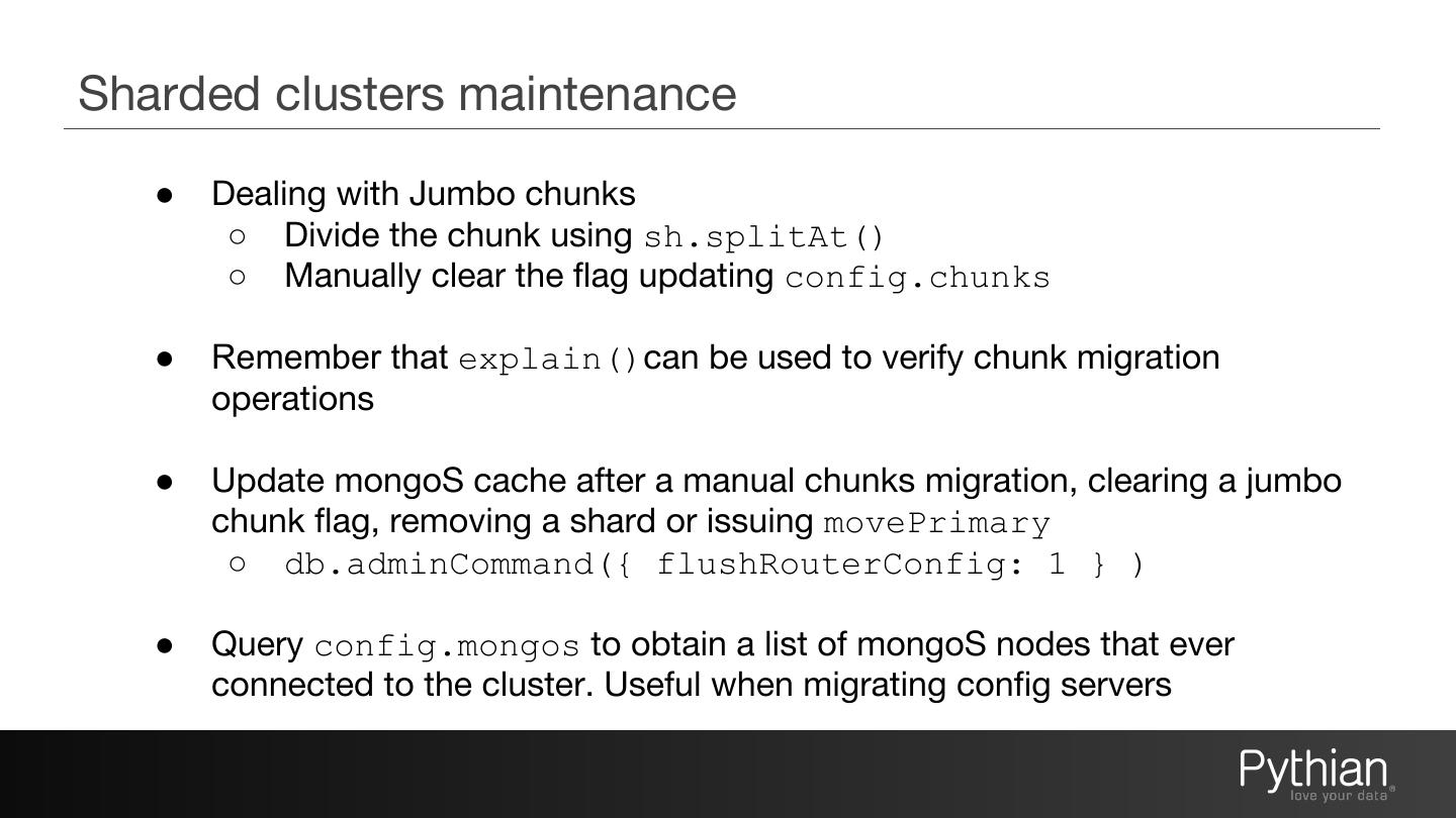18 .Sharded clusters maintenance ● Dealing with Jumbo chunks ○ Divide the chunk using sh.splitAt() ○ Manually clear the flag updating config.chunks ● Remember that explain()can be used to verify chunk migration operations ● Update mongoS cache after a manual chunks migration, clearing a jumbo chunk flag, removing a shard or issuing movePrimary ○ db.adminCommand({ flushRouterConfig: 1 } ) ● Query config.mongos to obtain a list of mongoS nodes that ever connected to the cluster. Useful when migrating config servers