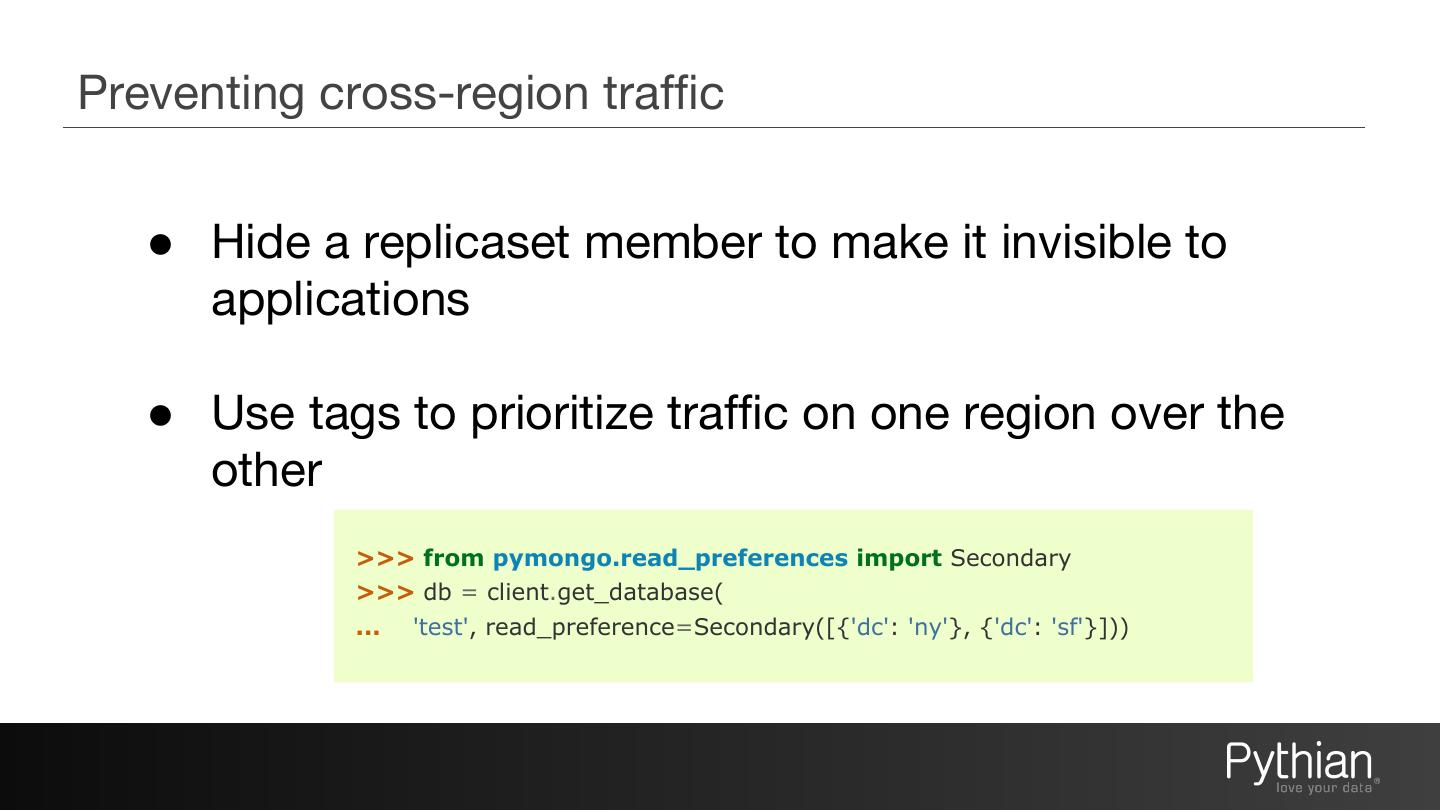 19 .Preventing cross-region traffic ● Hide a replicaset member to make it invisible to applications ● Use tags to prioritize traffic on one region over the other >>> from pymongo.read_preferences import Secondary >>> db = client.get_database( ... 'test', read_preference=Secondary([{'dc': 'ny'}, {'dc': 'sf'}]))