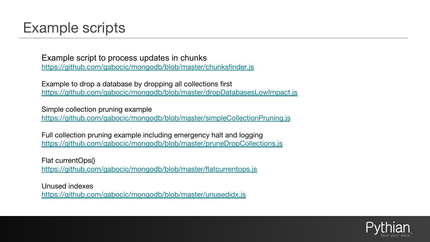 20 .Example scripts Example script to process updates in chunks https://github.com/gabocic/mongodb/blob/master/chunksfinder.js Example to drop a database by dropping all collections first https://github.com/gabocic/mongodb/blob/master/dropDatabasesLowImpact.js Simple collection pruning example https://github.com/gabocic/mongodb/blob/master/simpleCollectionPruning.js Full collection pruning example including emergency halt and logging https://github.com/gabocic/mongodb/blob/master/pruneDropCollections.js Flat currentOps() https://github.com/gabocic/mongodb/blob/master/flatcurrentops.js Unused indexes https://github.com/gabocic/mongodb/blob/master/unusedidx.js