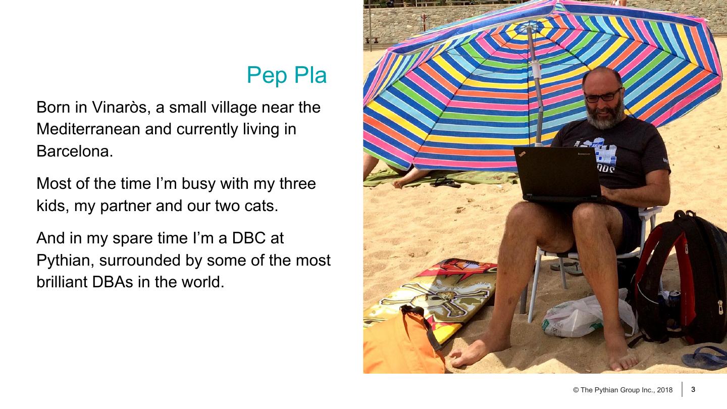 2 . Pep Pla Born in Vinaròs, a small village near the Mediterranean and currently living in Barcelona. Most of the time I’m busy with my three kids, my partner and our two cats. And in my spare time I’m a DBC at Pythian, surrounded by some of the most brilliant DBAs in the world. © The Pythian Group Inc., 2018 3