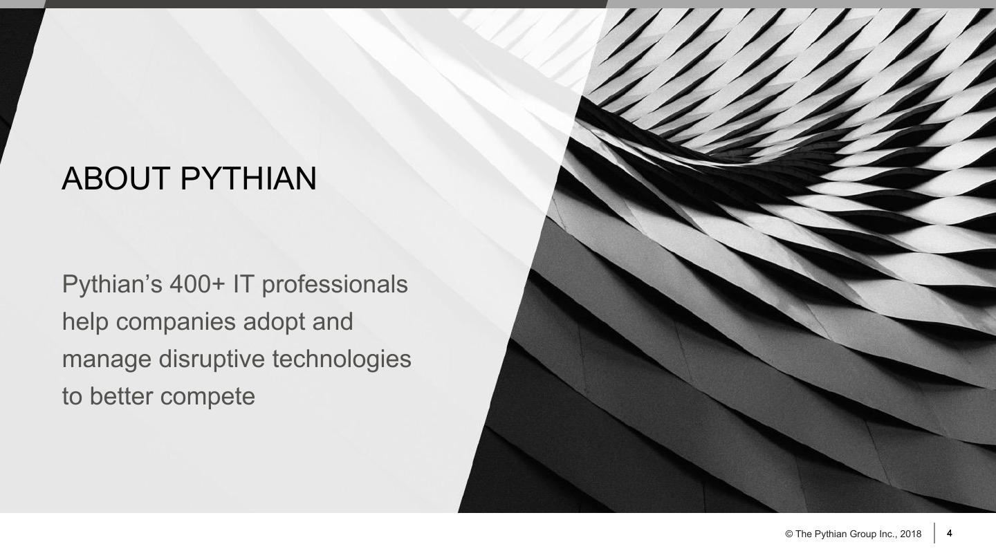 3 .ABOUT PYTHIAN Pythian’s 400+ IT professionals help companies adopt and manage disruptive technologies to better compete © The Pythian Group Inc., 2018 4