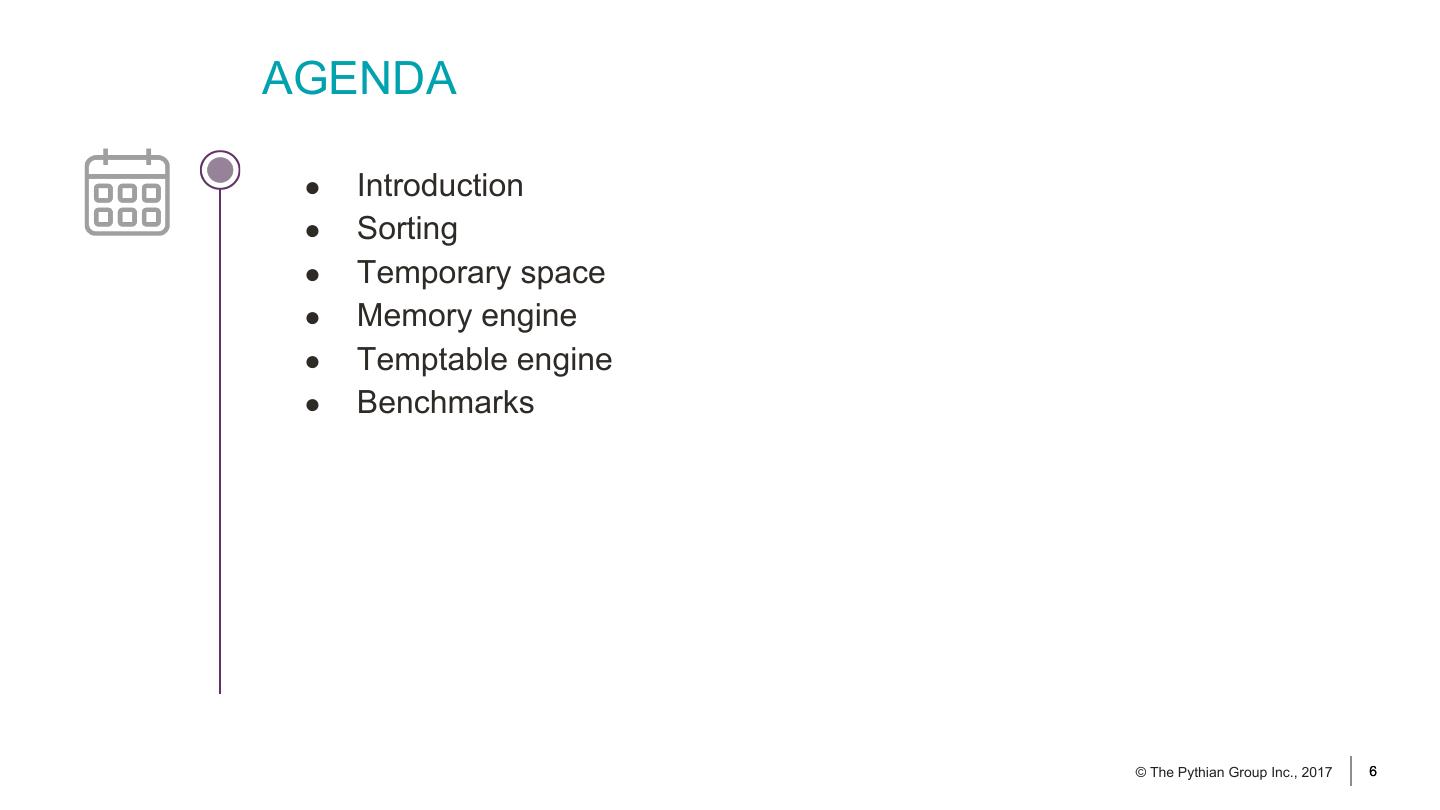 5 .AGENDA ● Introduction ● Sorting ● Temporary space ● Memory engine ● Temptable engine ● Benchmarks © The Pythian Group Inc., 2017 2018 6