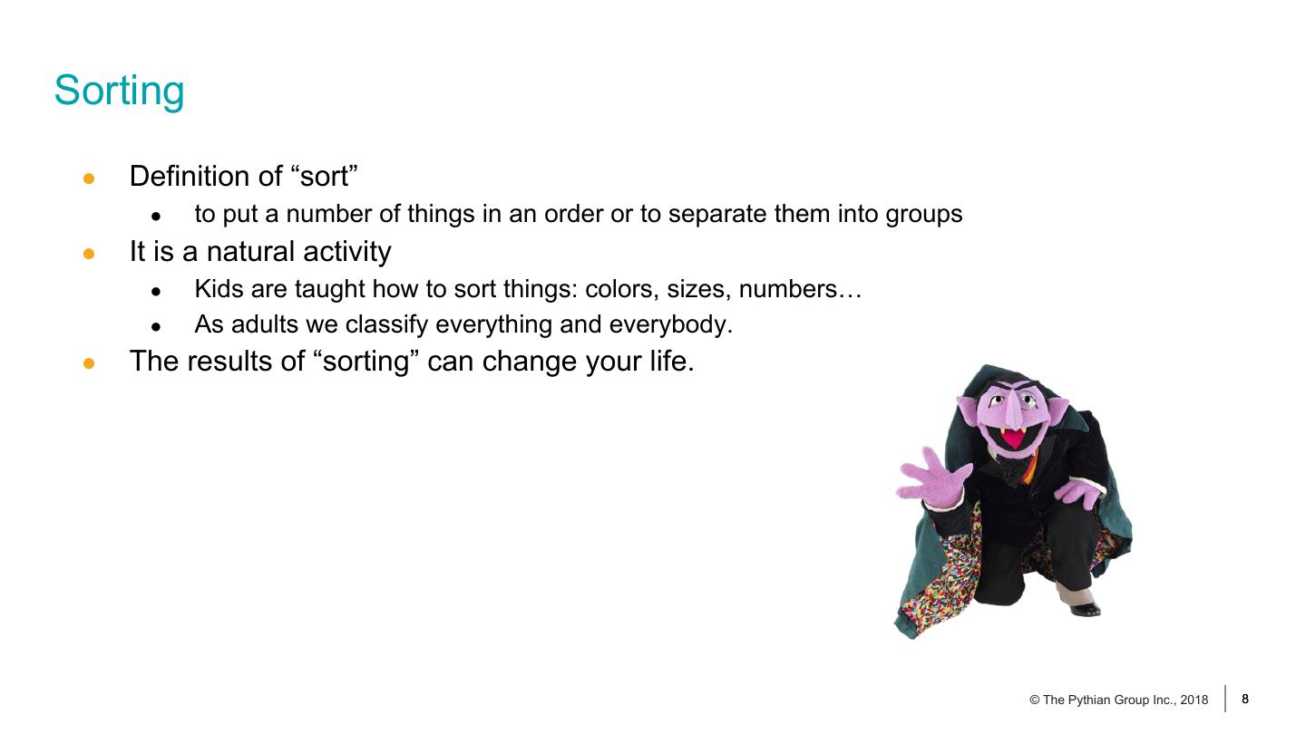 7 .Sorting ● Definition of “sort” ● to put a number of things in an order or to separate them into groups ● It is a natural activity ● Kids are taught how to sort things: colors, sizes, numbers… ● As adults we classify everything and everybody. ● The results of “sorting” can change your life. © The Pythian Group Inc., 2018 8