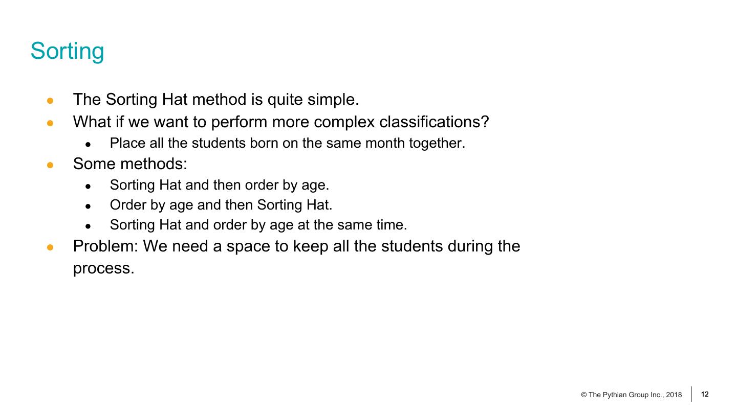 10 .Sorting ● The Sorting Hat method is quite simple. ● What if we want to perform more complex classifications? ● Place all the students born on the same month together. ● Some methods: ● Sorting Hat and then order by age. ● Order by age and then Sorting Hat. ● Sorting Hat and order by age at the same time. ● Problem: We need a space to keep all the students during the process. © The Pythian Group Inc., 2018 12