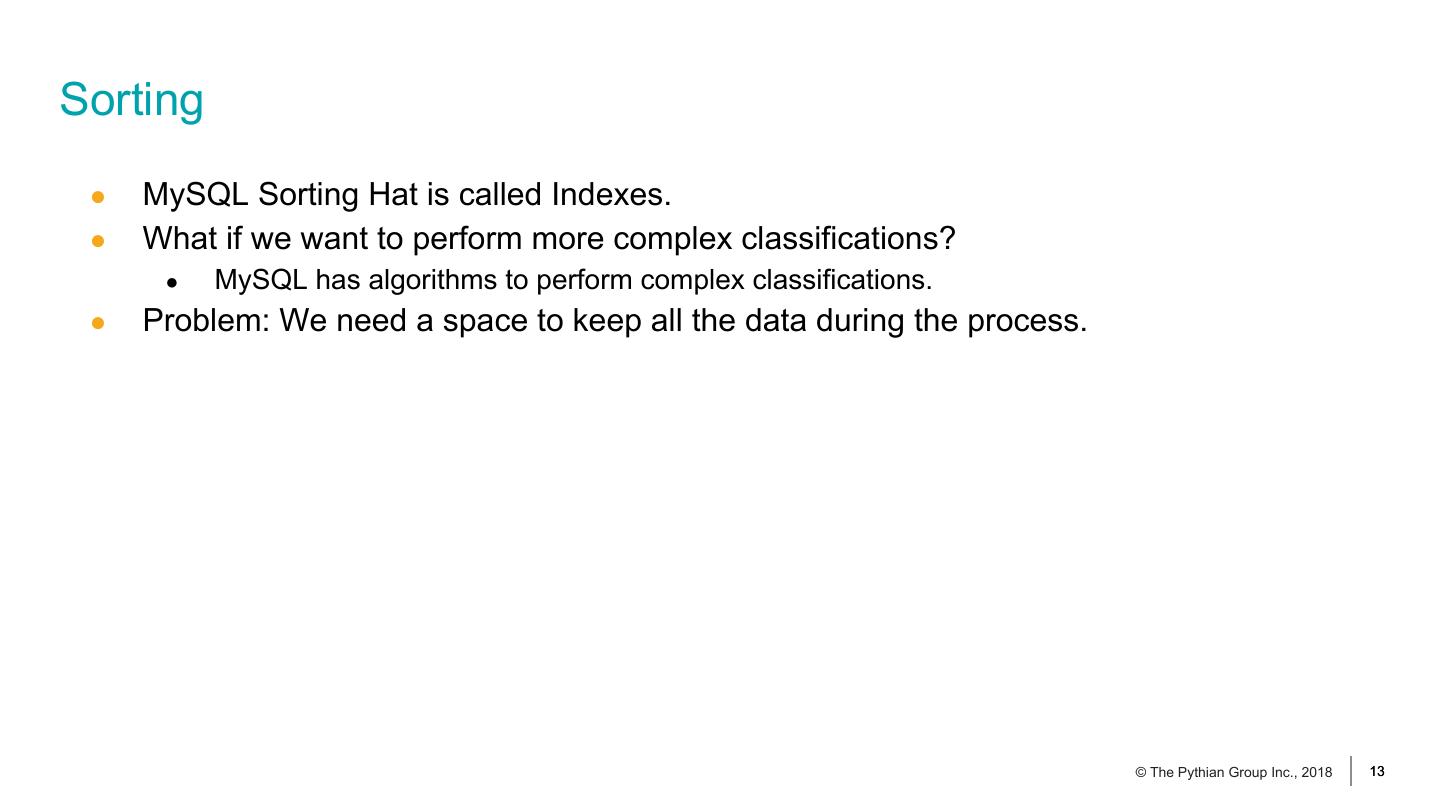 11 .Sorting ● MySQL Sorting Hat is called Indexes. ● What if we want to perform more complex classifications? ● MySQL has algorithms to perform complex classifications. ● Problem: We need a space to keep all the data during the process. © The Pythian Group Inc., 2018 13