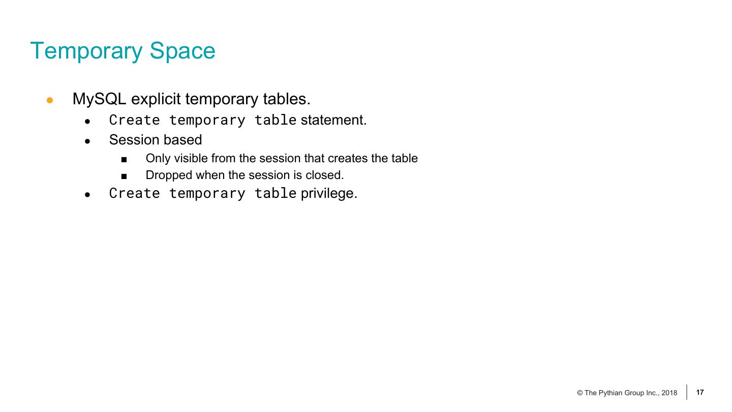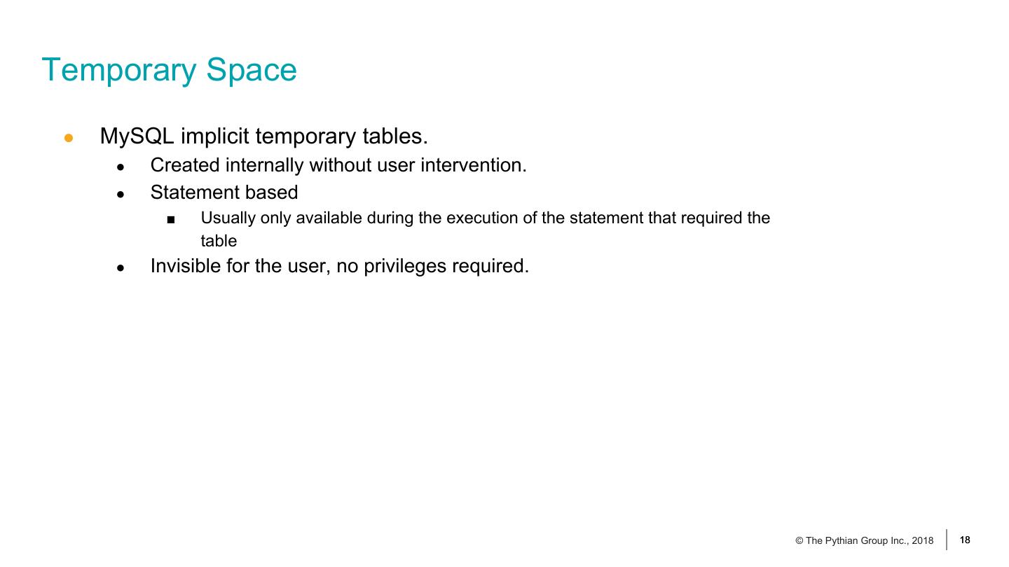 15 .Temporary Space ● MySQL explicit temporary tables. ● Create temporary table statement. ● Session based ■ Only visible from the session that creates the table ■ Dropped when the session is closed. ● Create temporary table privilege. © The Pythian Group Inc., 2018 17