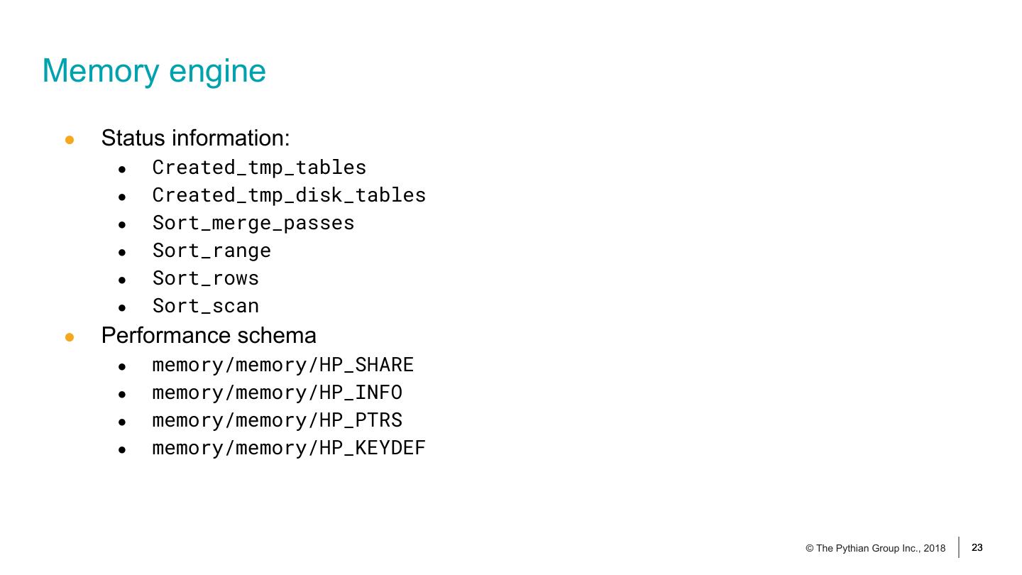 21 .Memory engine ● Status information: ● Created_tmp_tables ● Created_tmp_disk_tables ● Sort_merge_passes ● Sort_range ● Sort_rows ● Sort_scan ● Performance schema ● memory/memory/HP_SHARE ● memory/memory/HP_INFO ● memory/memory/HP_PTRS ● memory/memory/HP_KEYDEF © The Pythian Group Inc., 2018 23